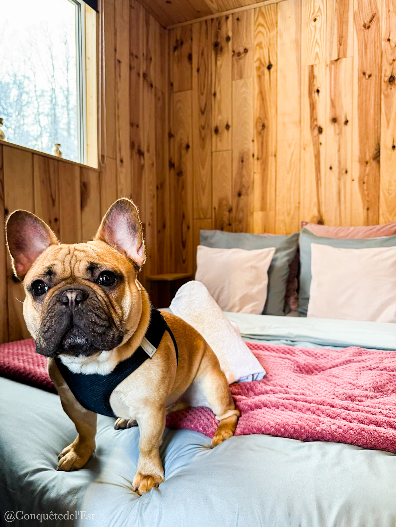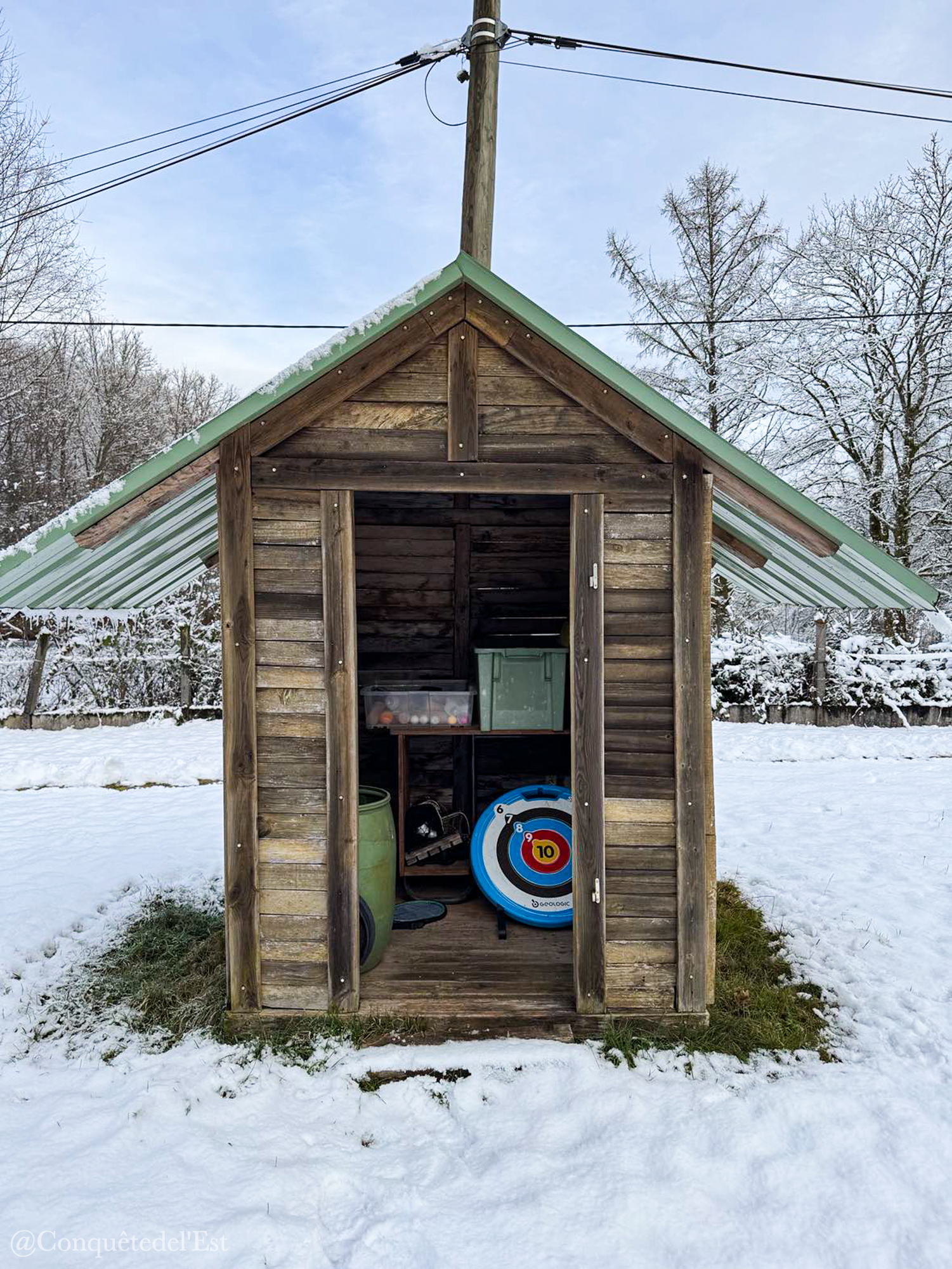 Elle peut accueillir deux personnes et est dog-friendly. Nous essayons maintenant de trouver des hébergements qui accueillent les chiens. La cabane est très bien équipée avec un espace nuit, une table pour manger, une cuisine toute équipée et une belle salle de bain. Tout est prévu pour ranger vos affaires (toujours appréciable dans les petites cabanes). Il y a une terrasse qui doit être top aux beaux jours pour siroter un verre en admirant l’étang. A côté de la cabane se trouve un ptit cabanon avec plein de choses pour s’occuper : raquettes de badminton, molky, fléchettes… Parfait pour des moments de rigolade en familles ou entre amis !
