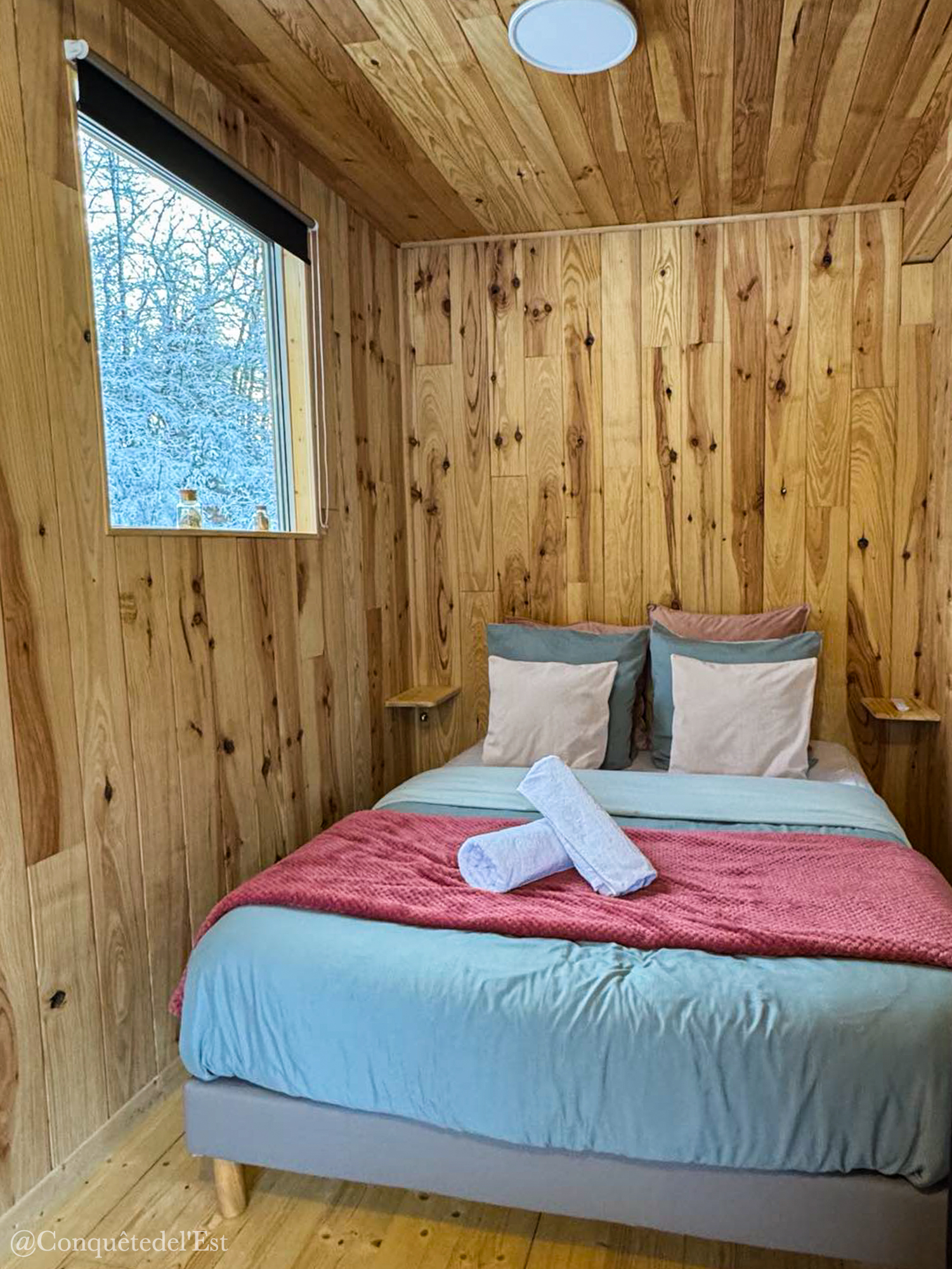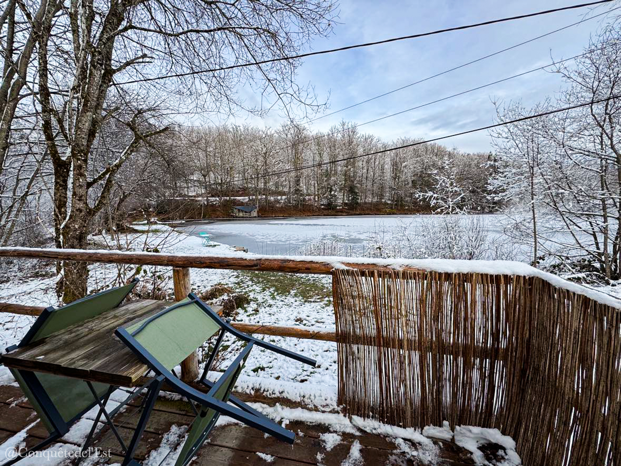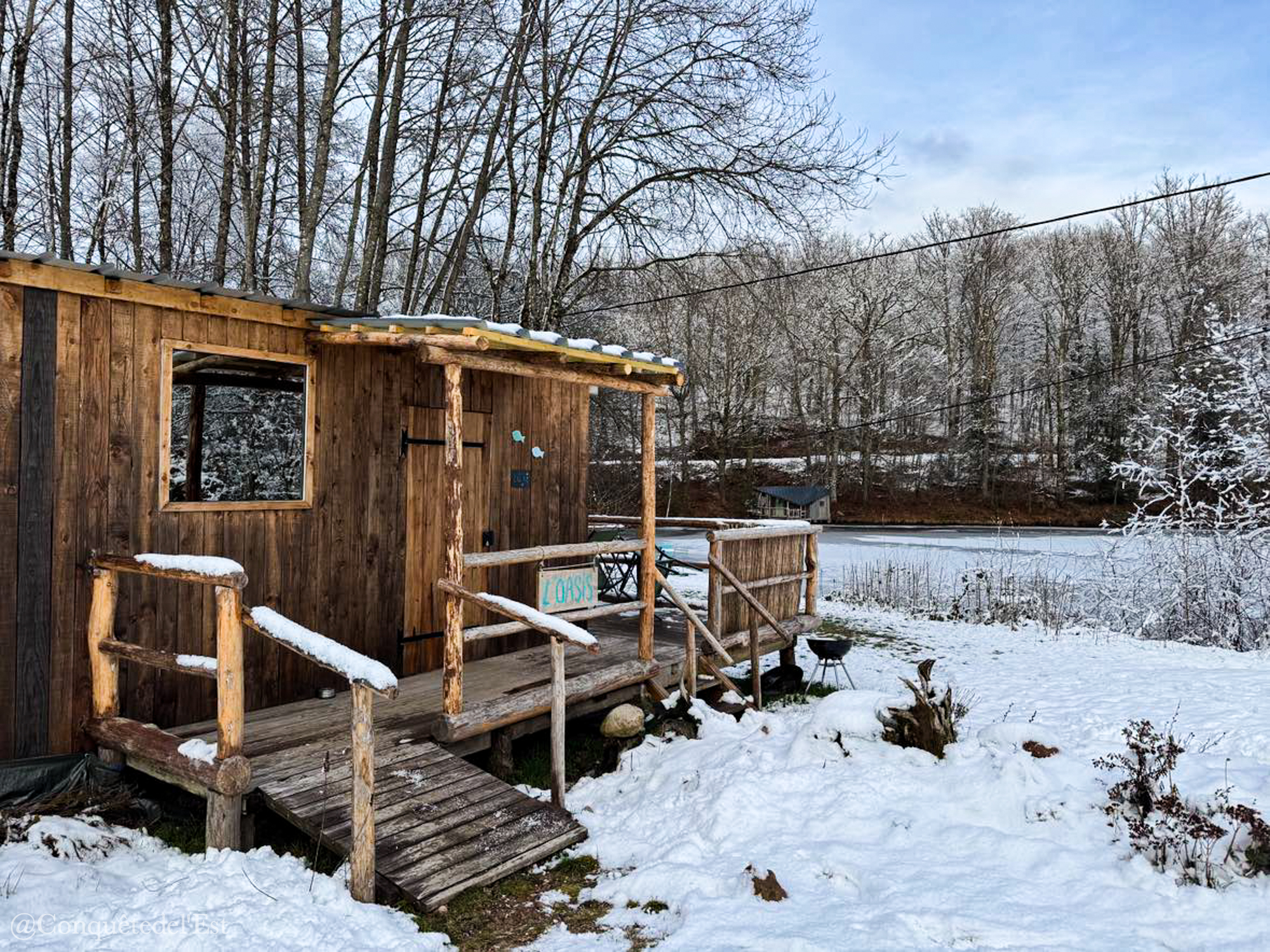 Et tout autour de l’étang se trouve des hébergements insolites : une roulotte, une cabane de trappeur, une cabane sur pilotis et l’Oasis. C’est la cabane que nous avons choisie. Une cabane toute en bois avec une vue directe sur l’étang.