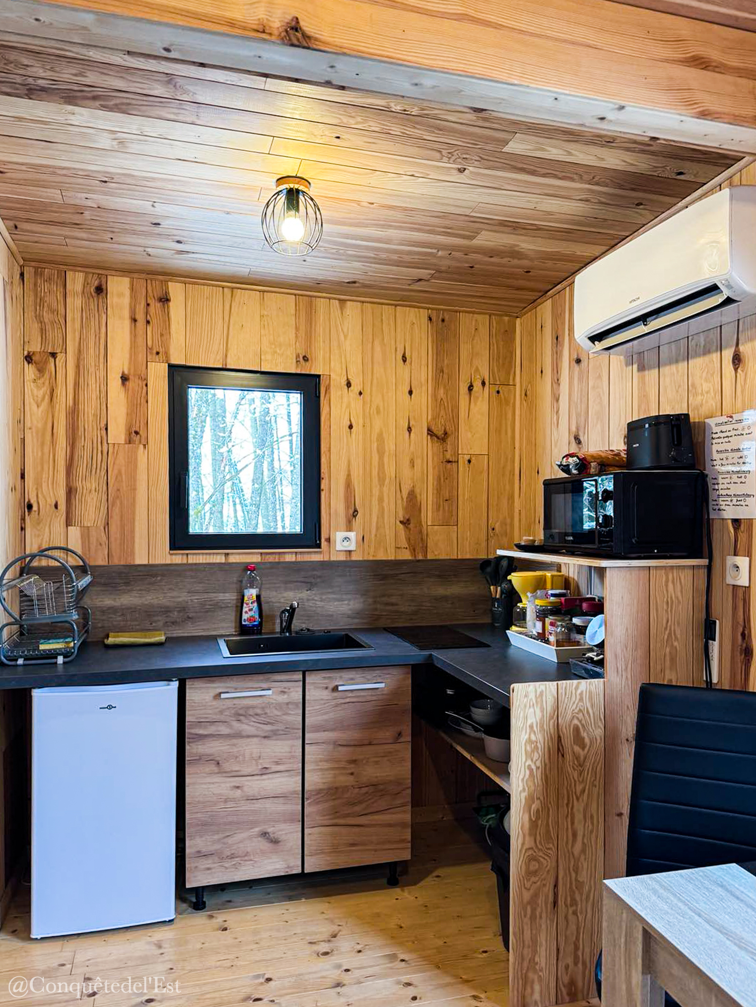 Le lendemain, nous avons pu se faire un ptit déjeuner avec tout ce qu’il fallait déjà dans la cabane. Nous avions peur d’avoir un petit froid (c’était lors d’une nuit de pluie verglaçante) mais pas du tout, une climatisation réversible est dans la cabane et on était vraiment bien.