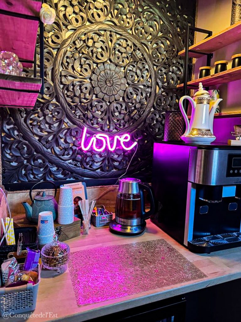 Mounir, c’est un ancien artisan créateur d’équipement de bien-être pour les hôteliers donc, c’est un peu son domaine dirons nous. Et c’est chez lui, qu’il avait fait son show-room et puis, un jour, il a dit stop. Il voulait faire profiter directement les gens de son savoir-faire. Et il a bien fait car Mounir, l’hospitalité, l’accueil, il a ça dans le sang. D’emblée, il vous met à l’aise, il a le sourire communicatif, une bienveillance qui rend déjà l’expérience unique.