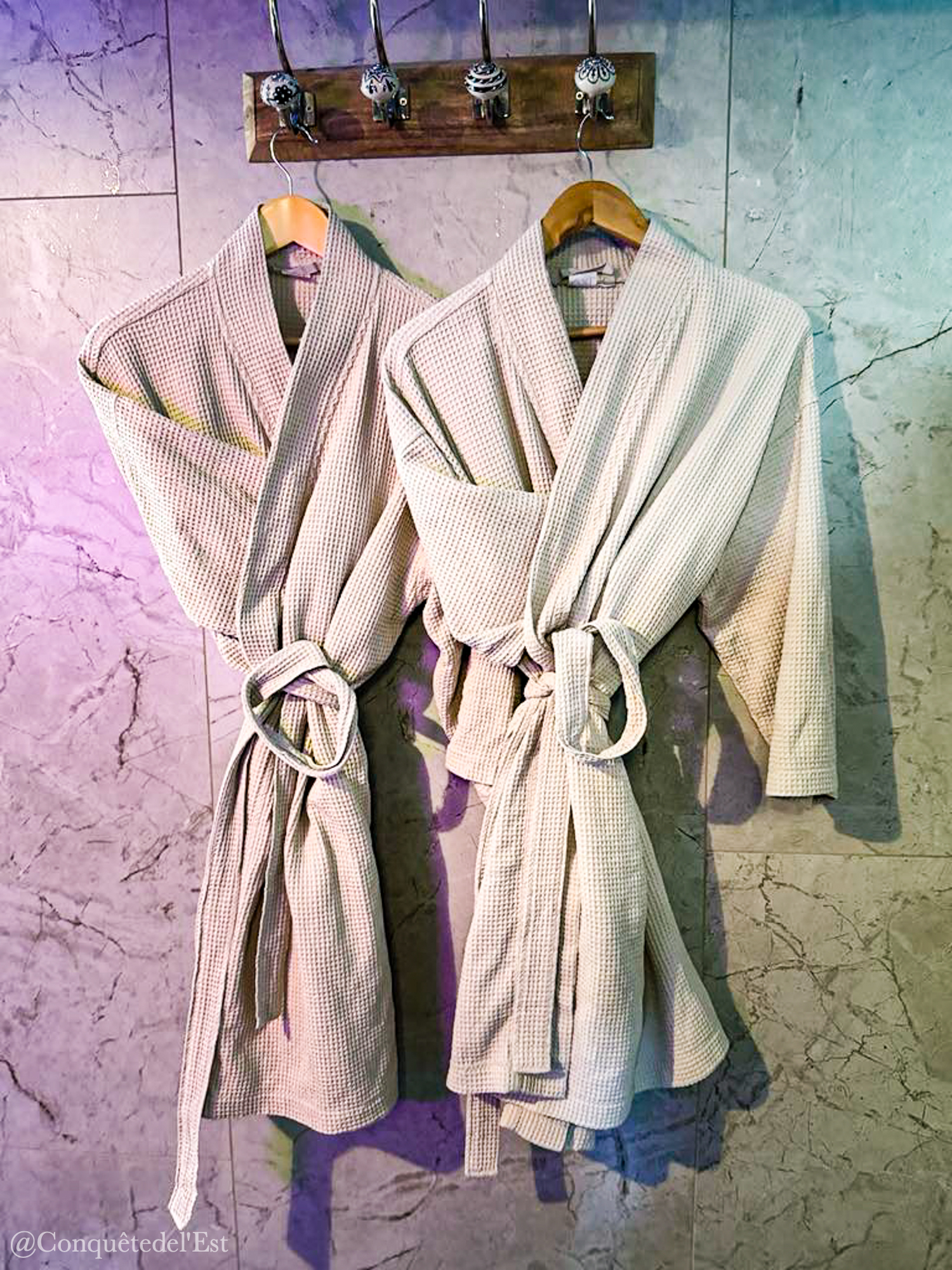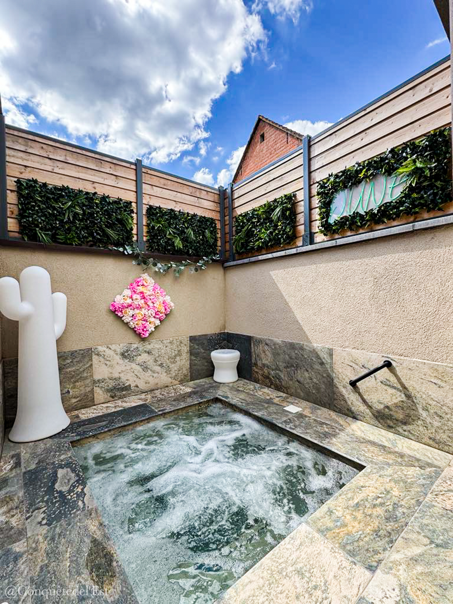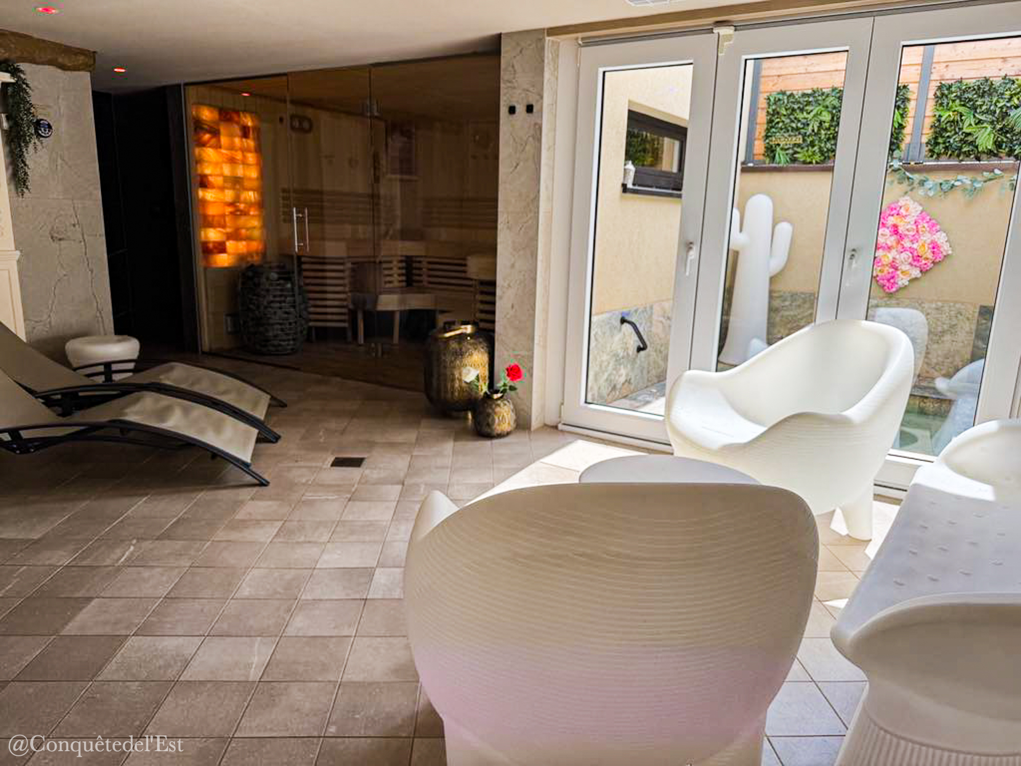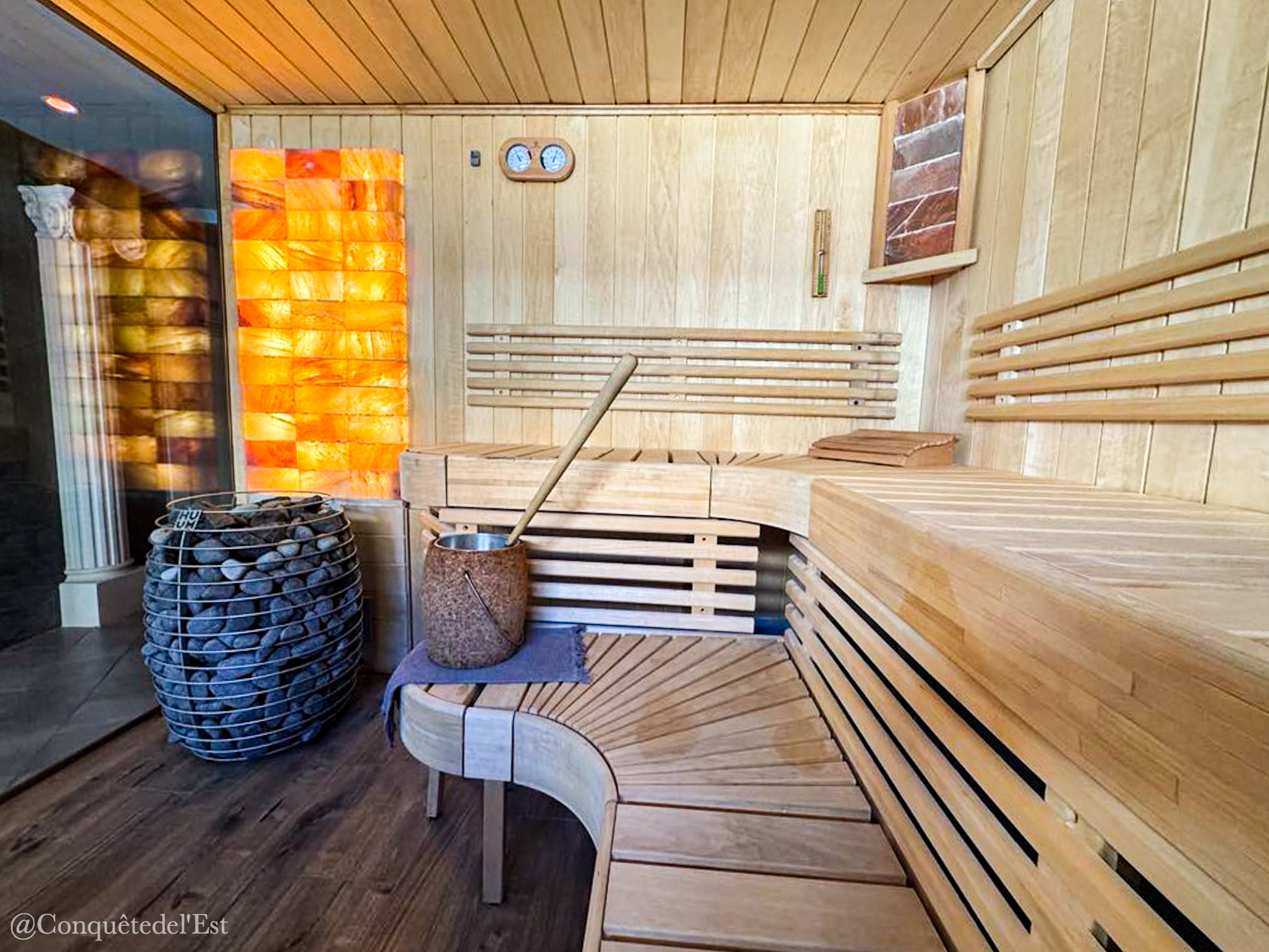 Au programme : un jacuzzi extérieur, un hammam, un sauna, des douches sensorielles. Des transats pour vous prélasser et un salon pour boire votre thé tranquillement. On a adoré le jacuzzi hyper minéral avec ses pierres et d’être dehors c’est toujours très agréable. Il faisait soleil quand on y est allés mais ça peut être génial aussi quand il fait froid ou quand il neige d’être au chaud dans l’eau. Le hammam à 45° est très agréable. Le sauna entre 45 et 60° a une colonne de sels d’Himalaya qui a des vertus pour la respiration et le système nerveux. Coup de coeur pour la senteur qui émane dans le sauna, je ne vous en dis pas plus, à vous de le découvrir !