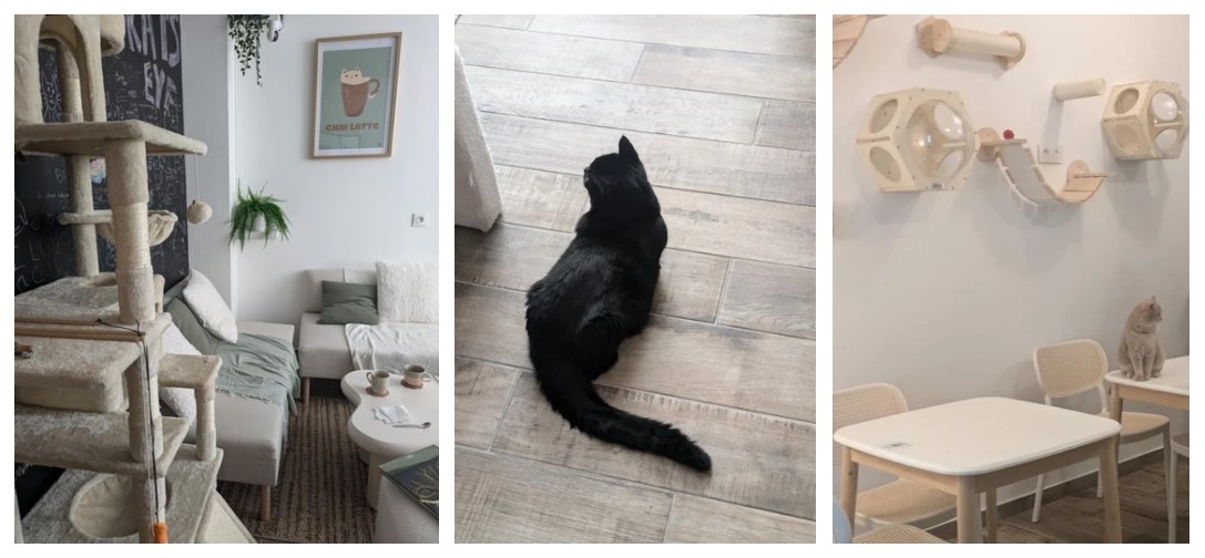 Lauraline est originaire de Belfort, et l’idée de travailler avec les animaux lui trottait dans la tête depuis longtemps. À 26 ans, elle a eu le courage de quitter son job pour se lancer dans cette nouvelle aventure ! Ses pensionnaires, elle les a choisi avec grand soin, puisqu’il faut que les chats s’entendent avec leurs colocataires félins ET humains. Aujourd’hui, il y a 4 chats qui occupent le café : Woody (l’espiègle noir et blanc aux pattes courtes), Phoebe (la princesse au pelage gris beige), Barney (le pacha persan) et Joey (le discret – je ne l’ai pas vu!). La salle est meublée de canapés, arbres à chats, jouets en tout genre pour interagir avec les chats si ils le souhaitent. Mais bon, vous n’êtes pas sans savoir que les chats dorment la plupart de la journée ! Ne venez pas au café dans l’optique d’avoir un chat sur les genoux pendant deux heures, ici, c’est eux qui décident 😉