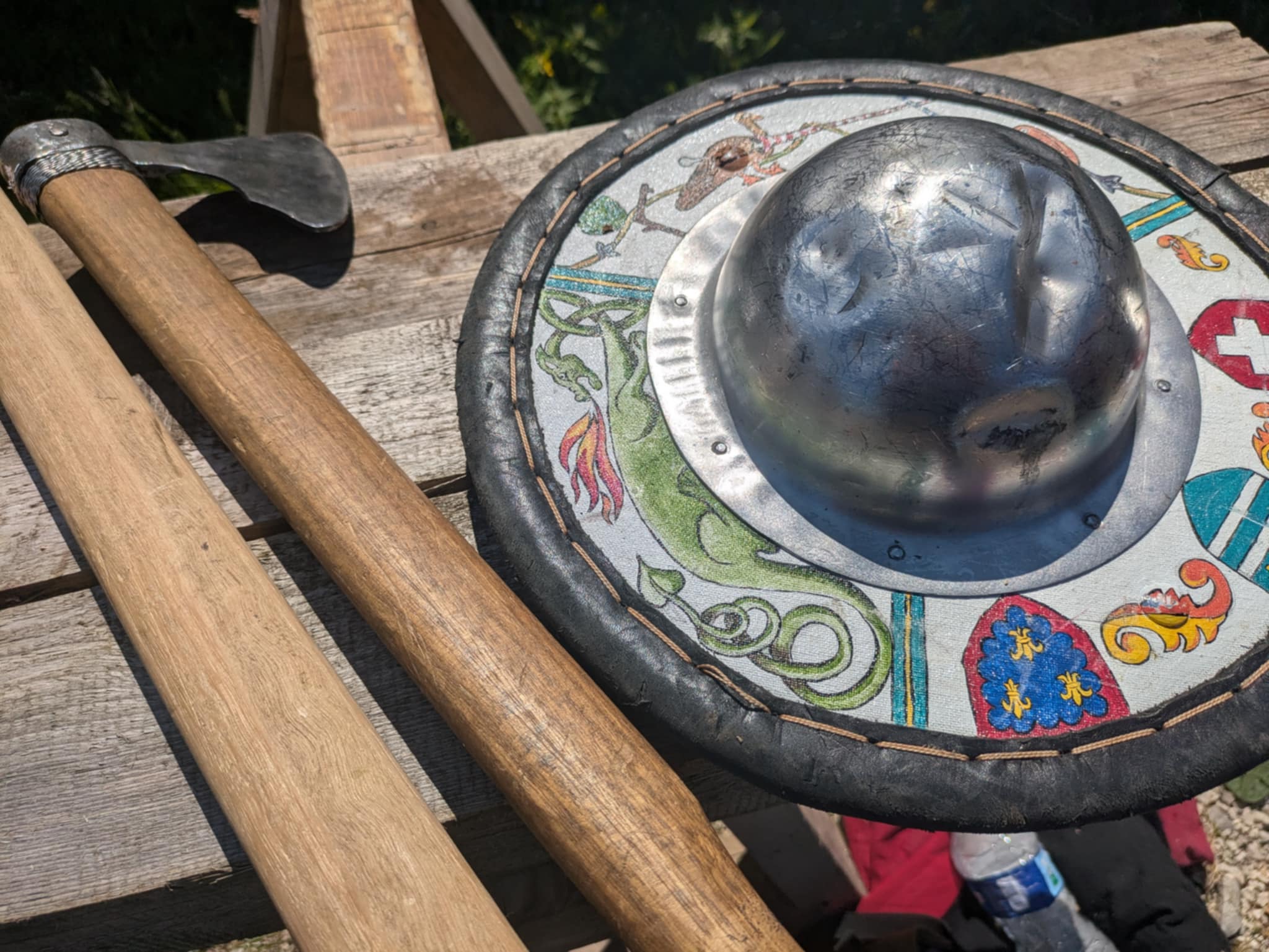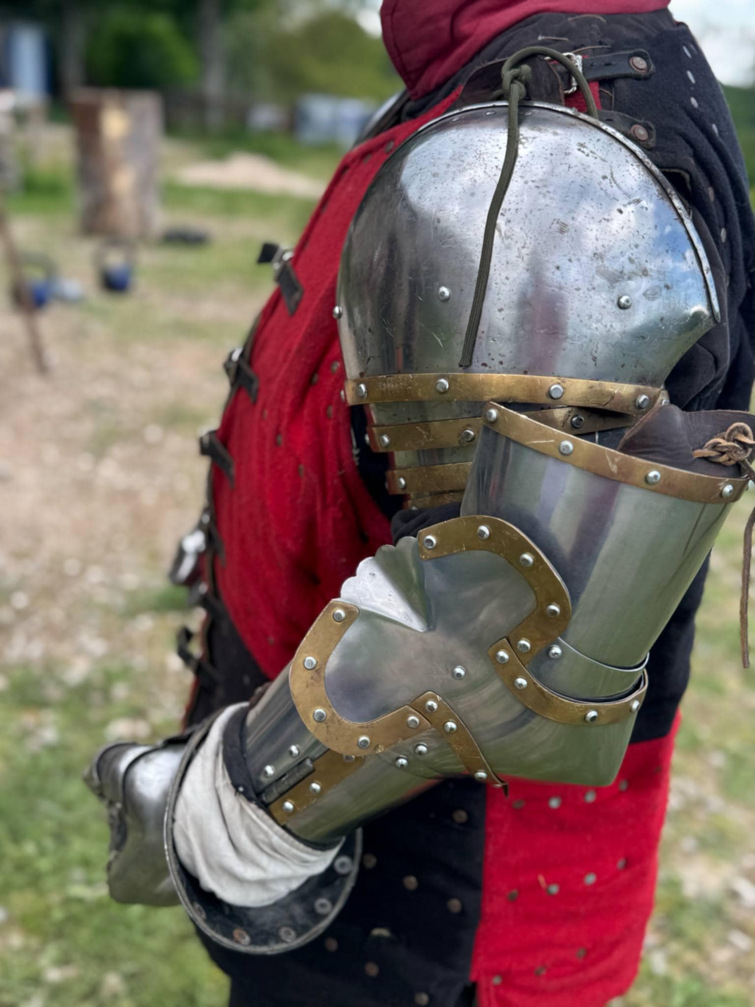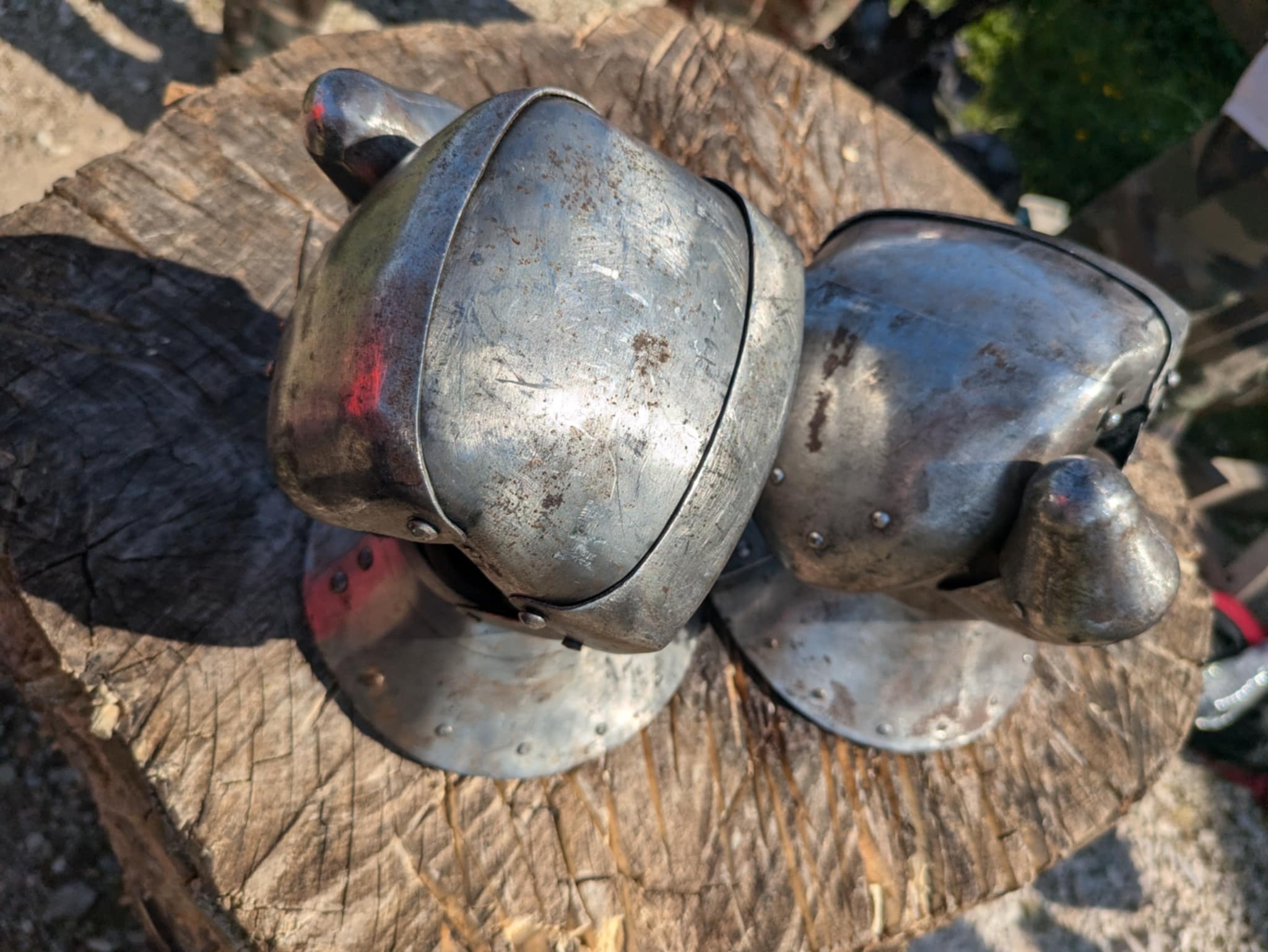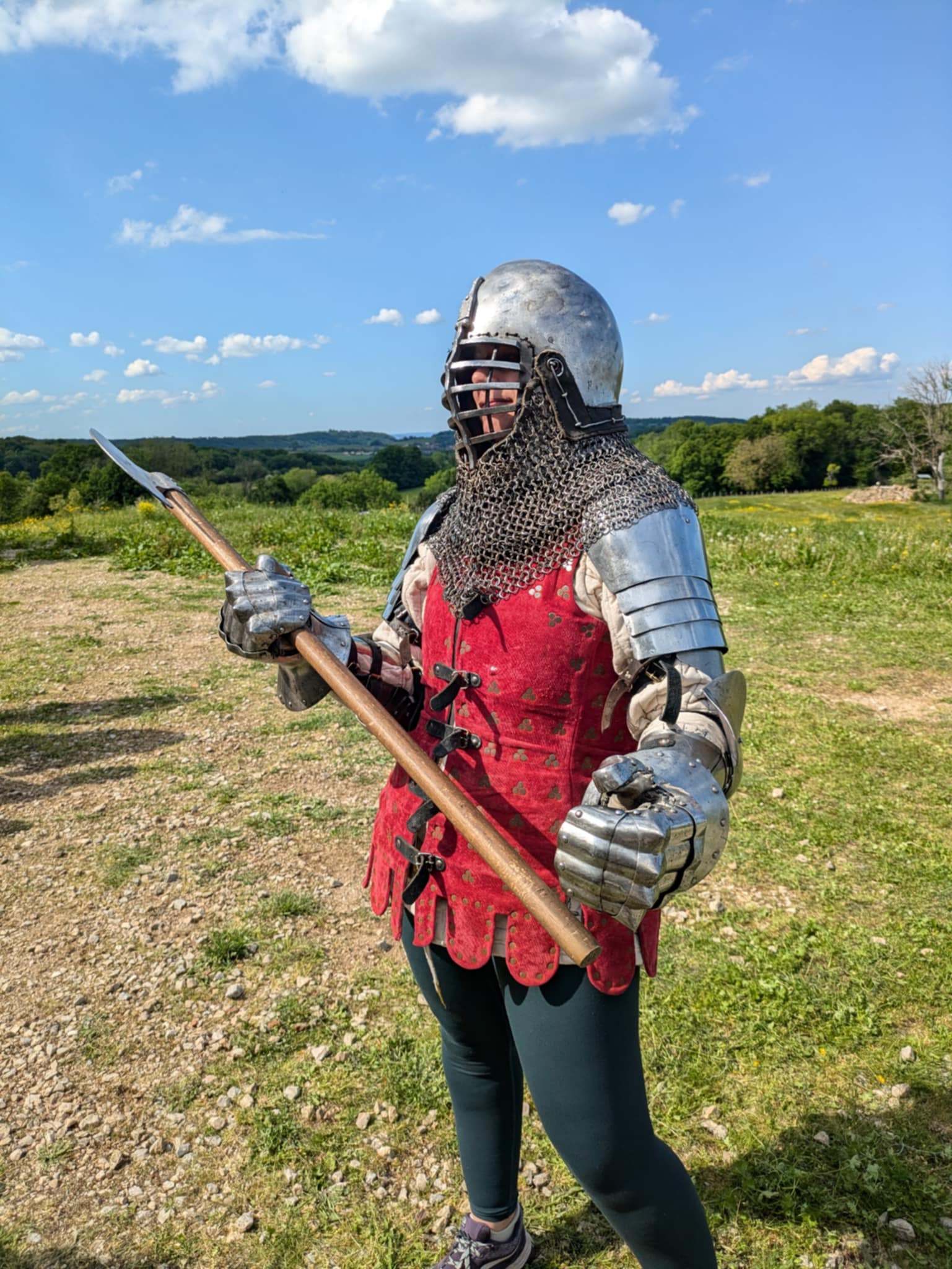 Dernière partie de la journée : porter l’armure ! Enfin, en partie, parce qu’il faut déjà un sacré temps pour enfiler la partie haute (j’essaie de trouver les bons termes et de pas écrire trop de bêtises) : Heaume, gantelets, brigandine (grosse veste matelassée renforcée avec des plaques en métal), toutes les parties métalliques pour les bras, et éventuellement le tabard (tunique aux couleurs de l’équipe). Et… tester de se prendre des coups avec. On va pas vous mentir, c’est très impressionnant de voir un gros gantelet métallique vous foncer droit sur le groin, même avec un casque ! Ou une hallebarde en direction du ventre. Ça donne un peu l’impression d’avoir la tête à l’intérieur d’une cloche d’église MAIS ça ne fait pas mal ^^ (et après tout le but c’est d’en distribuer plus que d’en recevoir :p)