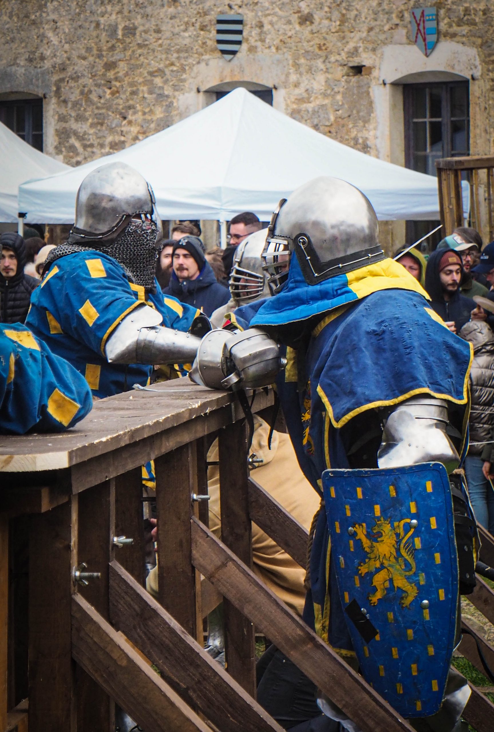 C’est parti pour la mêlée ! Équipe contre équipe dans la lice (sorte de « ring » médiéval délimité par un tour en bois), le but est d’éliminer ses adversaires en les faisant chuter (3 appuis au sol : hors jeu). Et pour cela, presque tous les coups sont permis : prises de sport de combat, coups, attaque avec les armes,… Je pense qu’une vidéo sera plus parlante pour vous rendre compte !