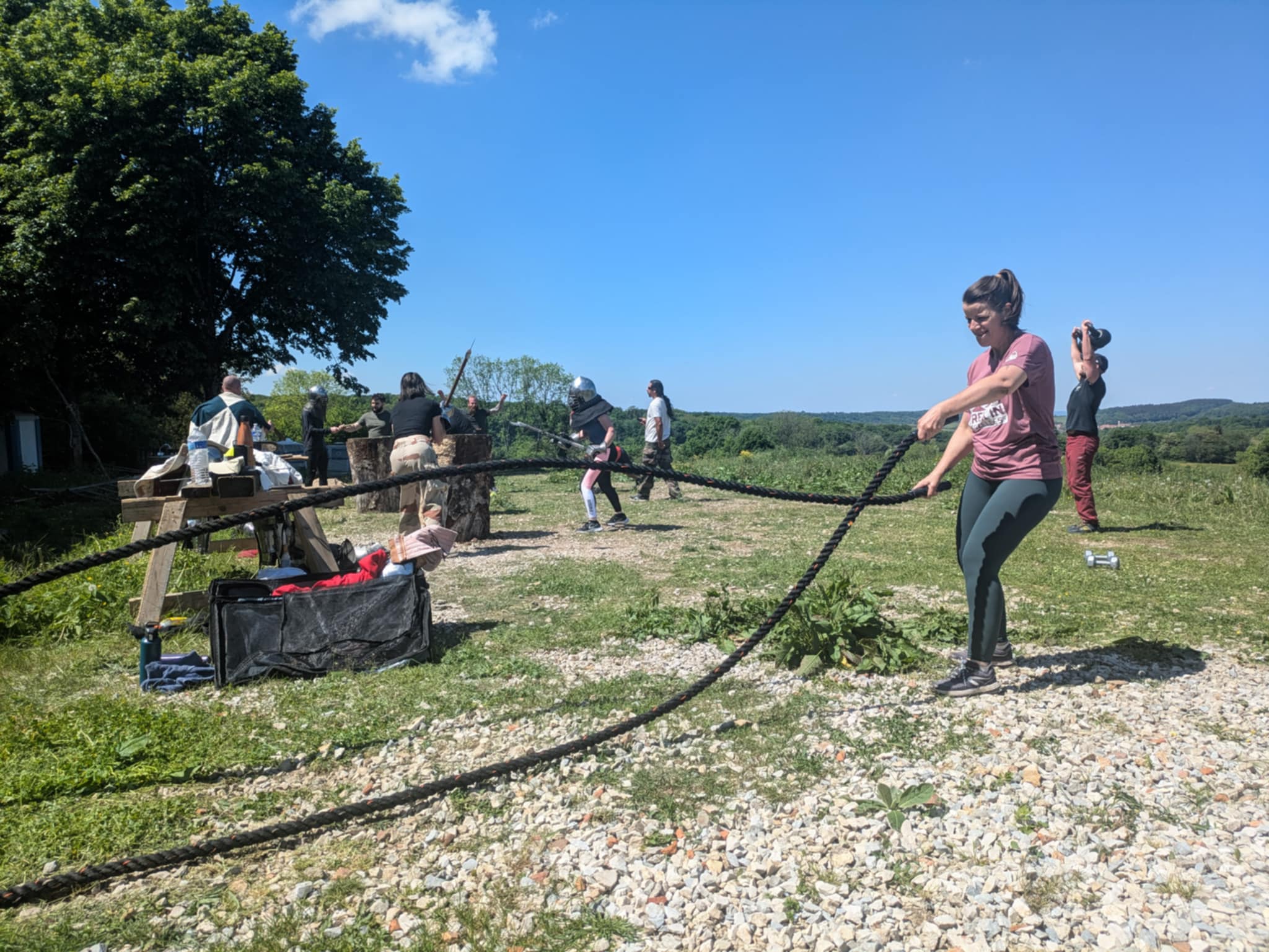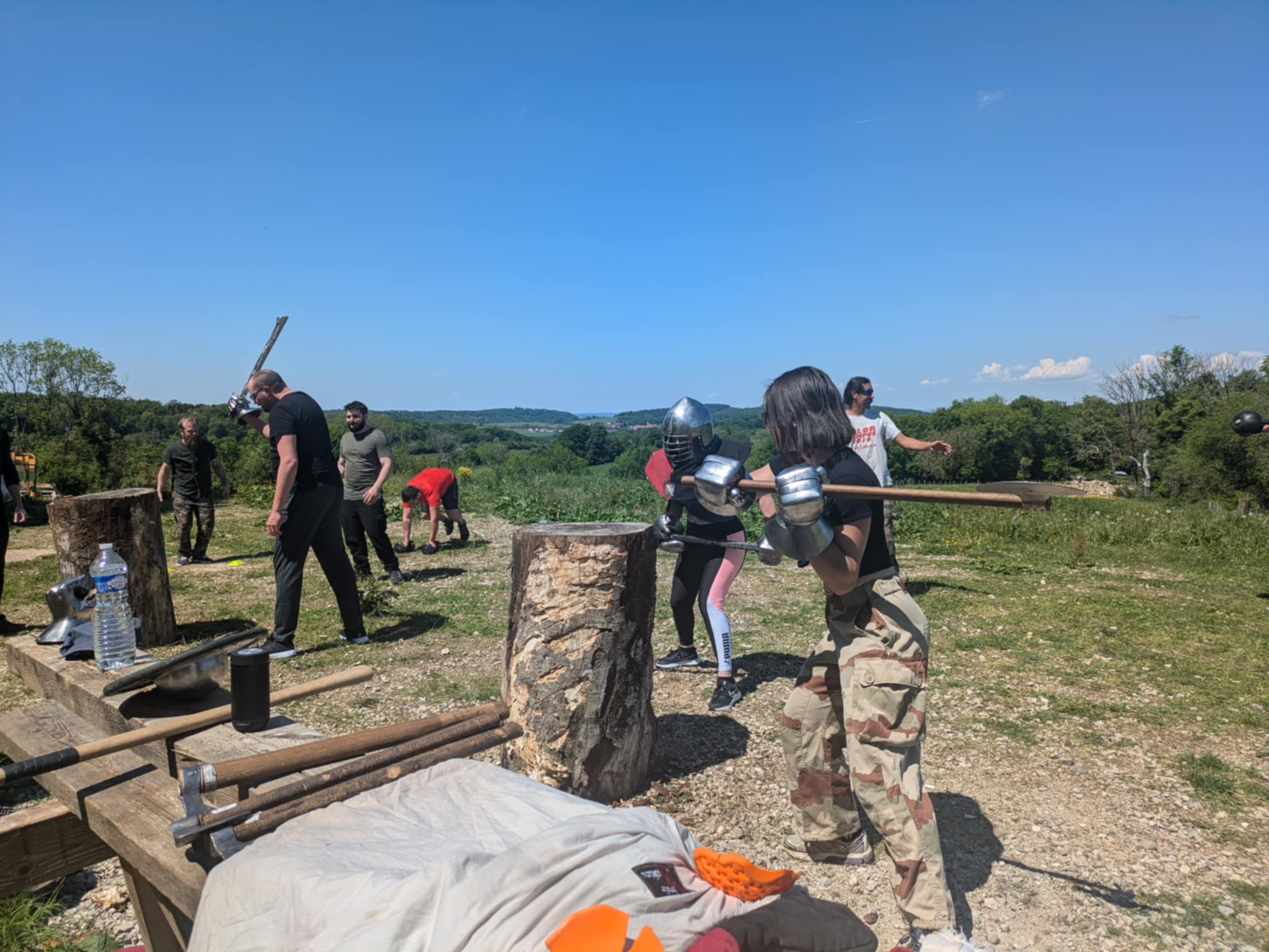 Ensuite, petit parcours type crossfit dans l’arrière château, avec quelques ateliers divers dans le but de nous fatiguer (LOL)(Spoiler alert : j’étais déjà morte) pour ressentir comment ça se passe au moment du combat avec l’armure. Un des ateliers consiste à frapper un énorme tronc à la hache avec un heaume sur la tête et les gants qui vont bien. On pige tout de suite que ça ne va pas être une mince affaire : le heaume est extrêmement lourd, et selon le modèle, la vision et l’ouïe sont sacrément altérés ! Maiiiis… frapper de toute ses forces sur le tronc se révèle quand même quelque peu… satisfaisant ^^ (ça défoule, faut bien l’admettre). (Faîtes pas ça chez vous.)