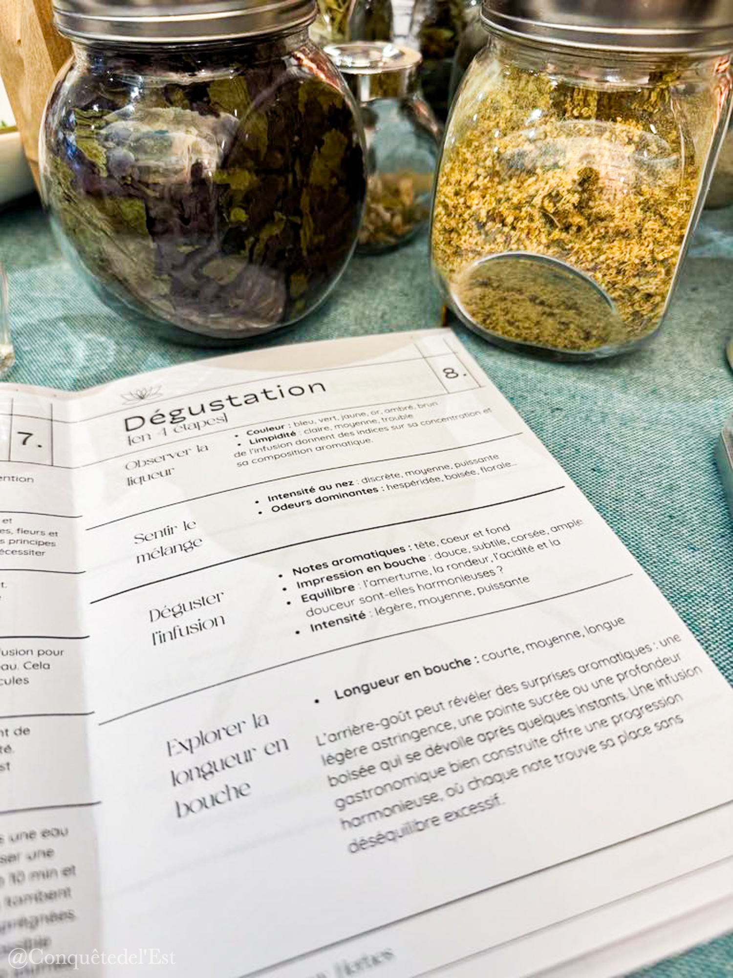 Chloé commence par nous faire un tour de table afin de nous présenter et nous avons chacune dit pourquoi nous étions là. Nous avions cette passion de la tisane en commun. Ensuite, nous avons testé nos connaissances gustatives et olfactives, mais je ne vais pas tout vous dévoiler car y’a des petits moments surprenants et je veux vous en laisser la surprise.
