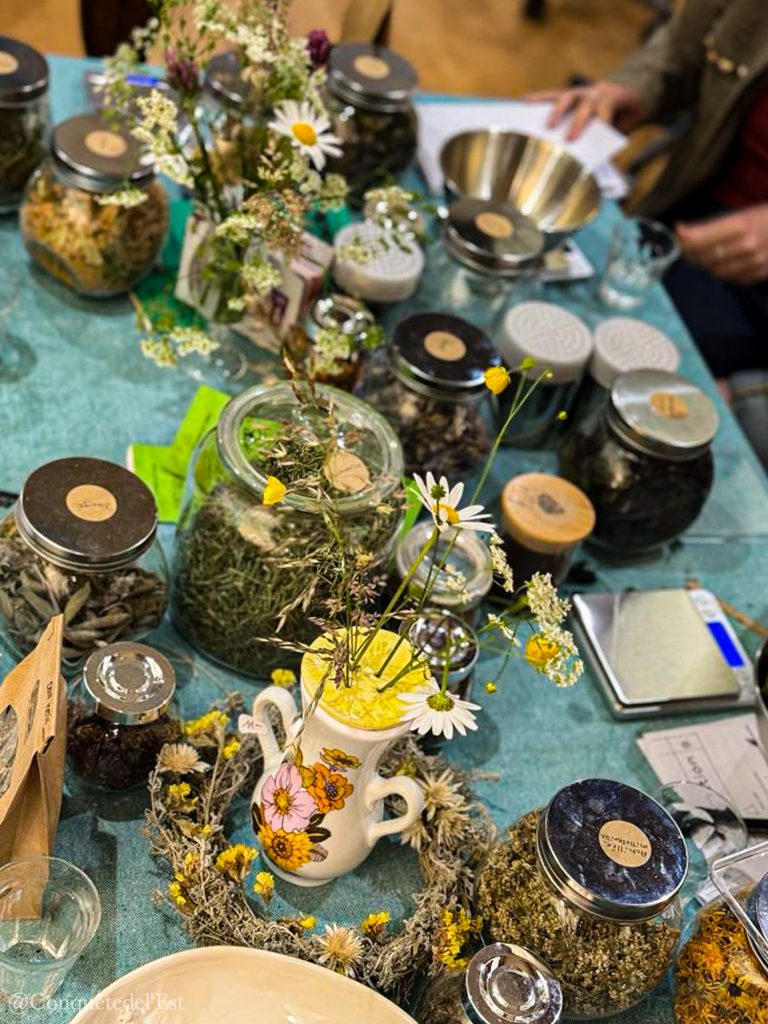 J’ai pu faire cet atelier dans la mignonne boutique belfortaine L’imaginarium (si vous ne connaissez pas encore, allez y vite !). Nous étions 6, ce qui est vraiment parfait pour ce genre d’ateliers, cela permet faire connaissance et d’échanger et chacune a pu s’exprimer tranquillement comme elle le souhaitait. Chloé avait installé une table trop trop mignonne, très bucolique où le sujet était clairement énoncé ! On avait chacune devant nous une petite balance, un carnet et un stylo. Au centre de la table, pléthores de pots remplis de plantes séchées, de quelques plantes fraîches et de jolis bouquets.