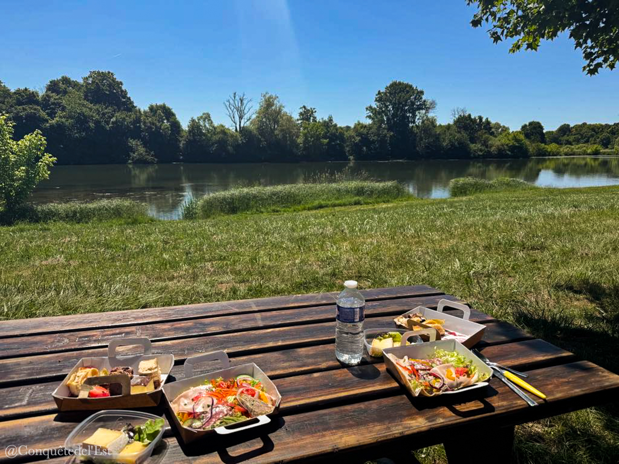 On continuera donc à rouler tranquillement, en profitant du paysage, entre rives de Saône, campagne avec ses champs et villages au loin. On arrivera pile à l’heure du déjeuner à la plage d’Autet. Il s’agit d’un bord de rivière aménagé où on peut se baigner. Il y a également un camping, accueil pour les camping-cars, et même une guinguette l’été ! On profitera d’un pique-nique concocté par le Bistrot des frangines à Scey sur Saône, c’était très bon, simple et efficace.
