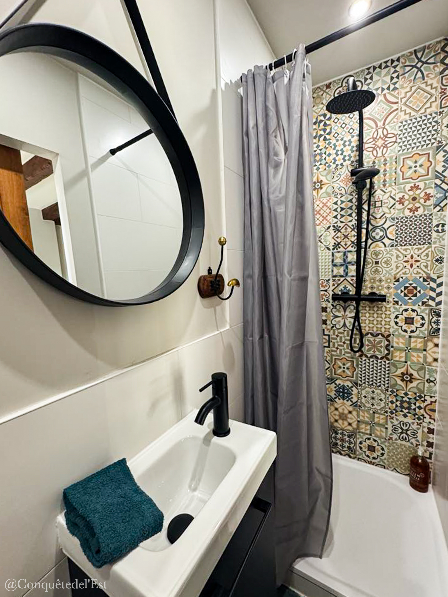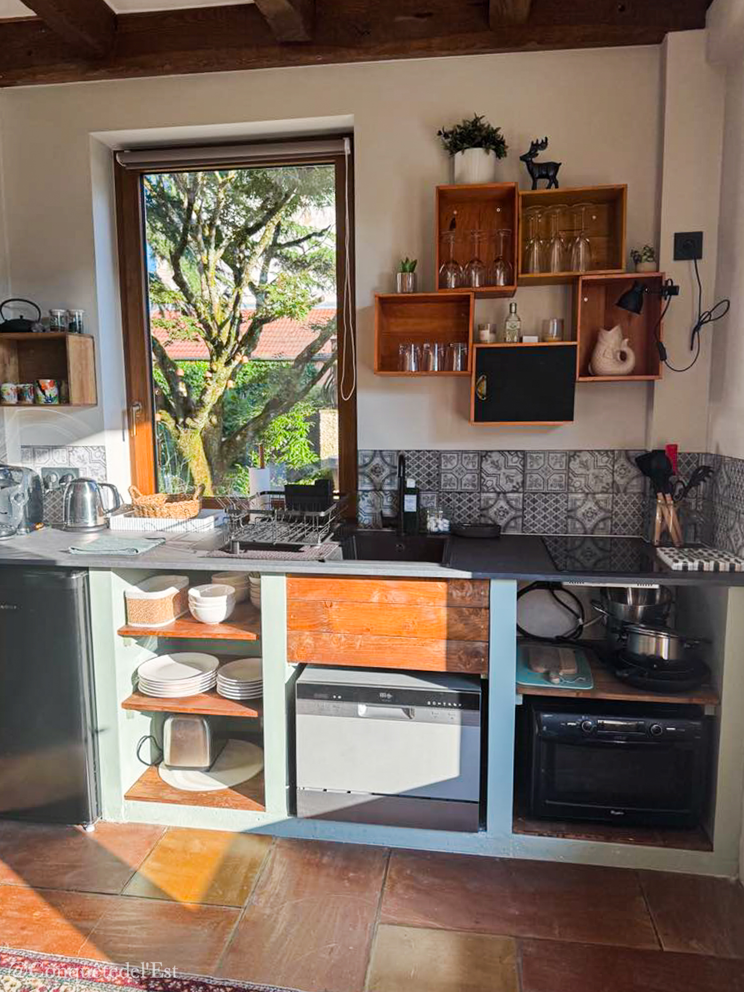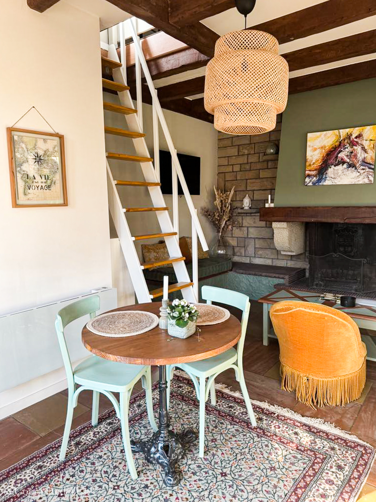 À l’intérieur, c’est tout mignon, avec un mix d’ancien, de bois et de moderne avec des couleurs pastel qui rendent le tout très chaleureux. On trouvera une petite cuisine équipée toute en bois, un salon salle à manger hyper cosy avec une cheminée… qui marche ! Quelques livres pour découvrir la région, une télé. La salle de bain attenante est petite mais parfaite. À l’étage, se trouve la chambre avec un espace bureau. Elle a ce charme des pièces mansardées. J’adore ce genre de chambre, on a envie d’y passer des heures, sous les poutres, à rêvasser, à s’imaginer mille vies. En plus, la déco éclectique invite à la rêverie.