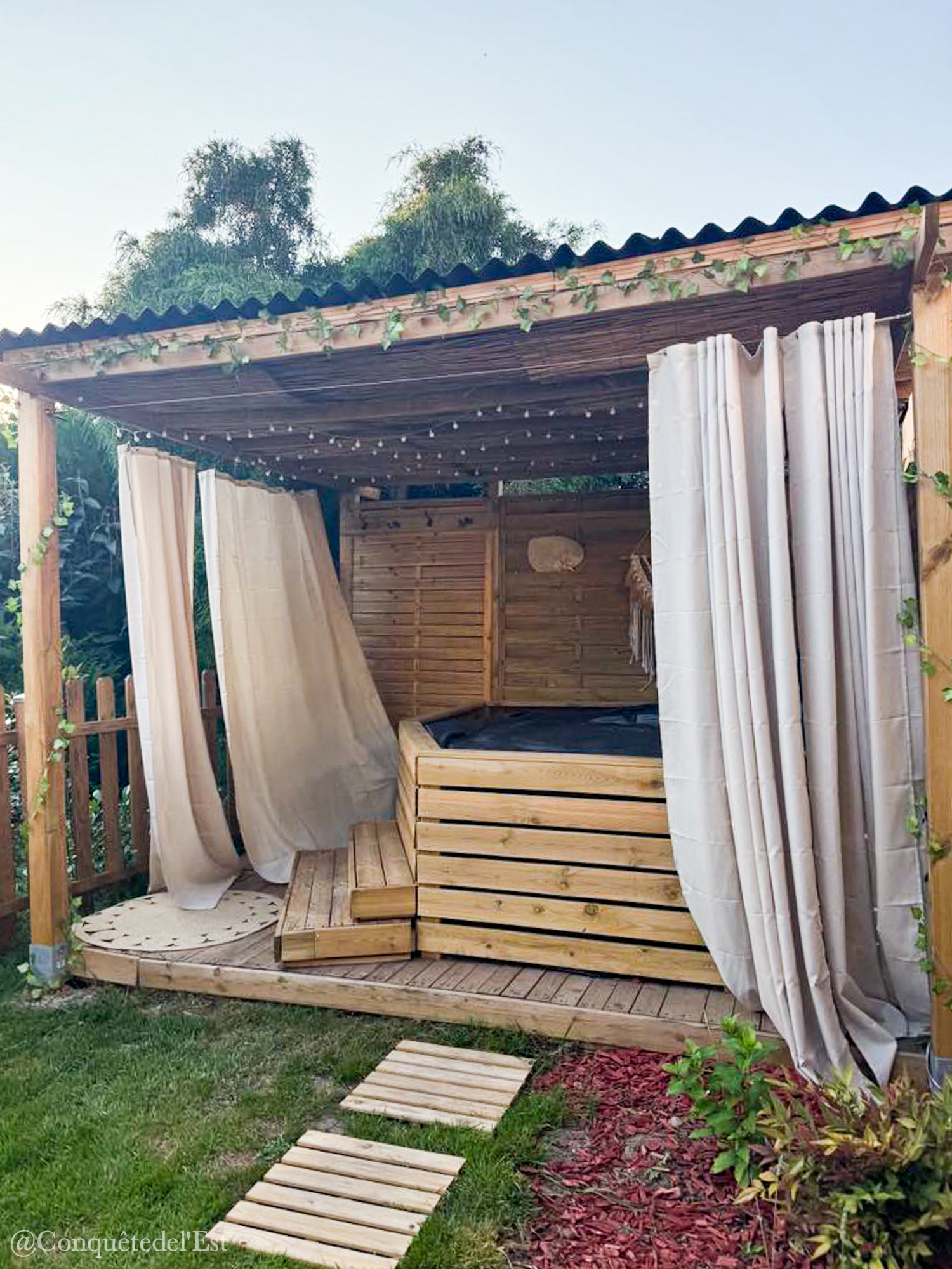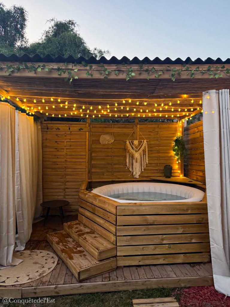 Et le grooooos plus de ce logement, c’est à l’extérieur que ça se passe. Direction le fond du jardin pour aller au spa ! Sous un abri tout en bois donc, encore une fois, on retrouve ce côté chaleureux, se trouve un jacuzzi. Et ça, c’est vraiment top ! Le fait qu’il soit protégé, comme ça, tout de bois vêtu, ça rend l’expérience encore plus chouette, plus intimiste. Vous pouvez tirer les rideaux si vous voulez encore plus d’intimité. Et quand vient le soir et que vous allumez les ptites lumières, c’est magique !