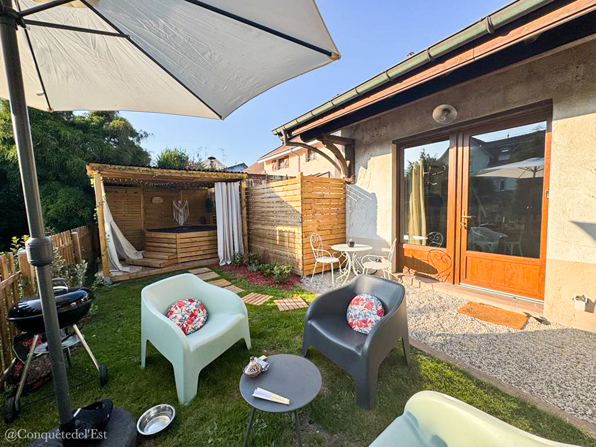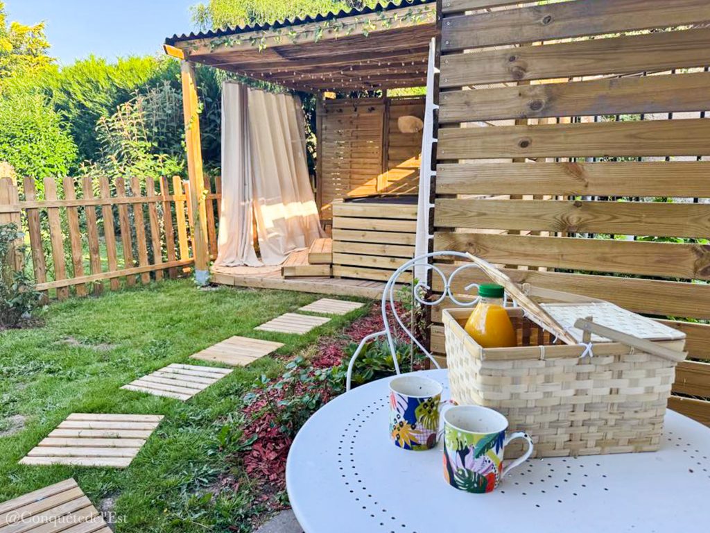 Ils ont, d’ailleurs, clôturé un petit jardinet pour que vous soyez à l’aise dehors, de quoi mettre un salon de jardin pour prendre l’apéro, bouquiner, se reposer tout simplement. Une petite table et deux chaises complètent le tout, et c’est parfait pour prendre l’apéro, manger ou petit-déjeuner dehors. Un barbecue est à disposition également. On voit qu’il y a eu bel effort d’aménagement extérieur avec un panaché de plantes et d’arbustes en devenir, ça va être super beau quand tout aura poussé !