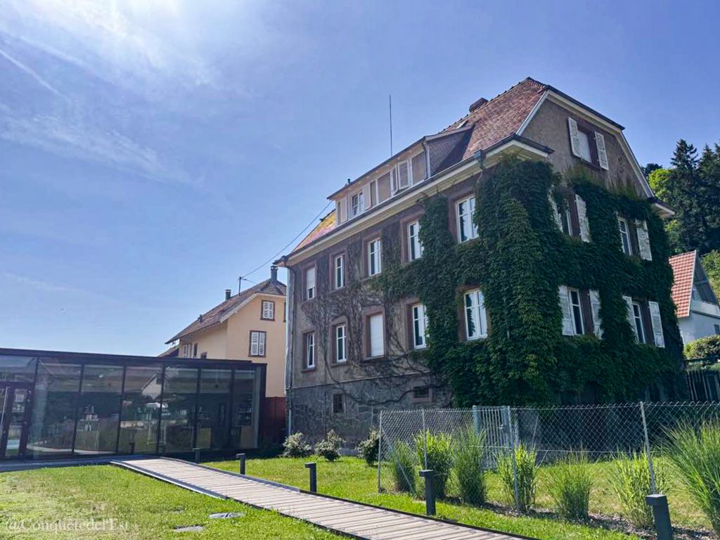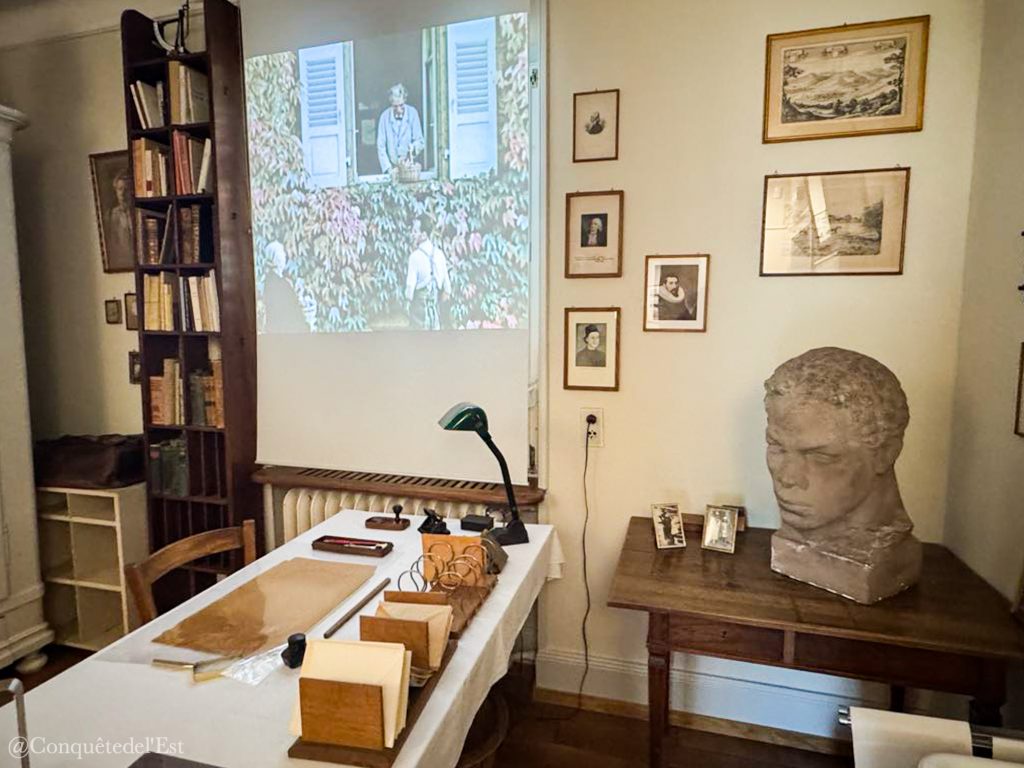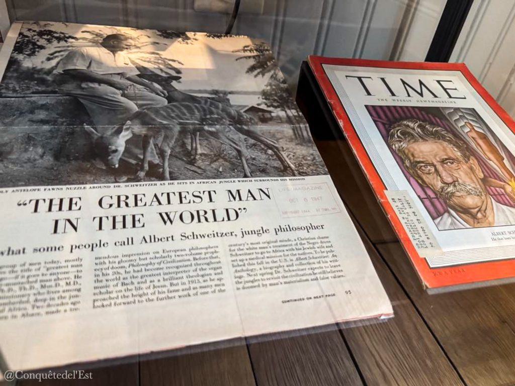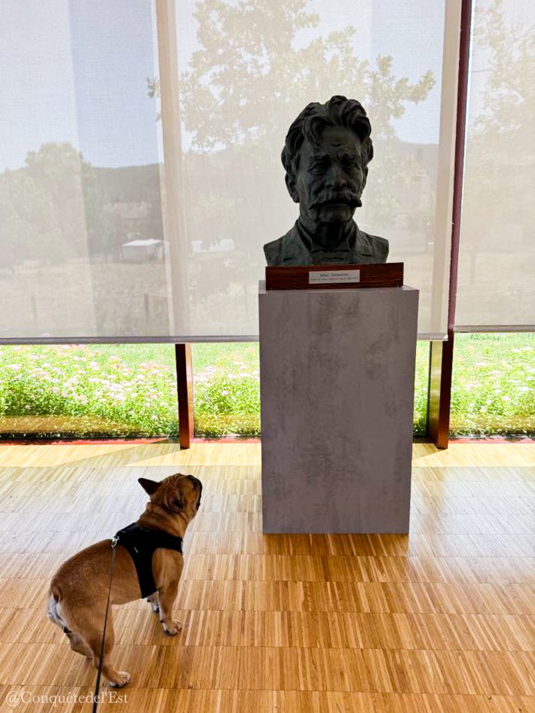 Ensuite, nous sommes allés visiter la maison Albert Schweitzer à Gunsbach, juste à côté de Munster. Alors, j’avoue que je ne connaissais absolument pas la vie de ce monsieur et j’étais, donc, très curieuse d’aller découvrir le musée qui lui ai consacré. Et quel plaisir de pouvoir emmener Arod avec nous. Bien souvent, on pense que les musées n’acceptent pas les chiens et bien, renseignez-vous, il y en a plus qu’on ne le croit qui les acceptent ! Nous avons pu faire la visite guidée et je vous la conseille vraiment, c’est assurément le meilleur moyen pour tout savoir et tout comprendre de sa vie et de son œuvre. Albert, il était plein de choses à la fois : théologien, pasteur, musicien, médecin, musicologue, écrivain. Il a fondé dans les années 1910 un hôpital au Gabon, mais pas un hôpital comme les autres. Un endroit humaniste, où les cultures des patients étaient respectées, privilégiées et au centre de la cure. Ses recherches, ses résultats de ce travail lui valurent le prix Nobel de la paix en 1952. Il était un fervent défenseur du vivant et ne voyageait qu’en bateau, entre la France (l’Alsace) et le Gabon. Ce fut si intéressant de découvrir tout son parcours, ses pensées, ses tourments, sa vision du monde et ses œuvres. Je vous conseille vraiment d’aller visiter sa maison et de découvrir, à votre tour, la vie d’Albert Schweitzer. Arod était un peu décontenancé par sa toute première visite au musée, mais il a apprécié cet endroit climatisé et a profité du rythme lent de la visite pour se reposer un peu.