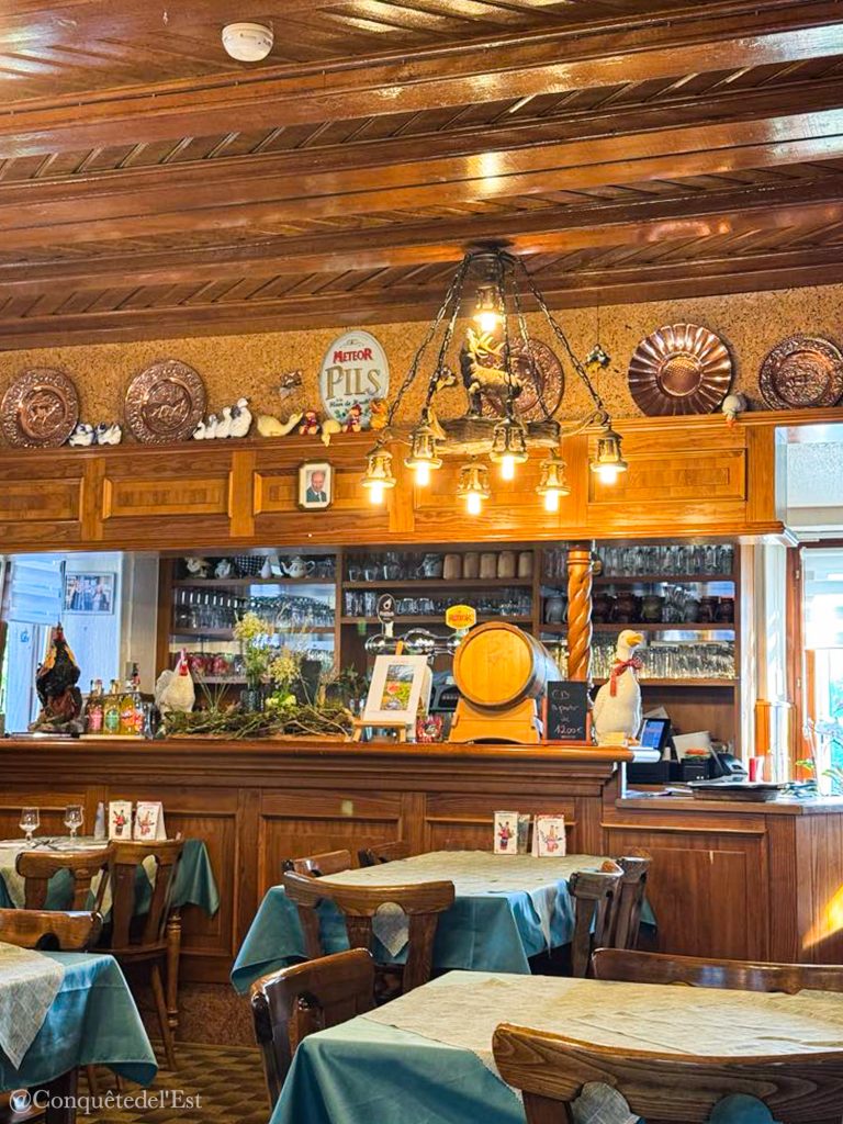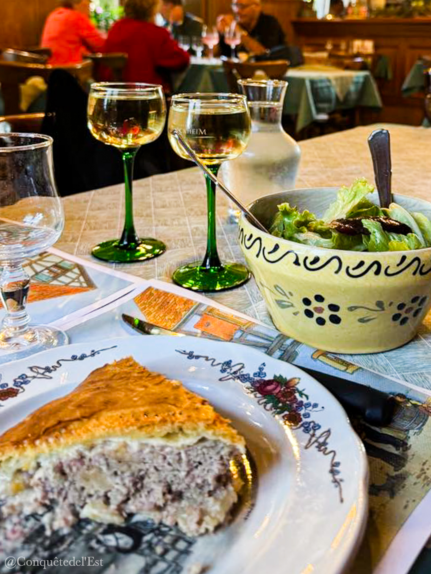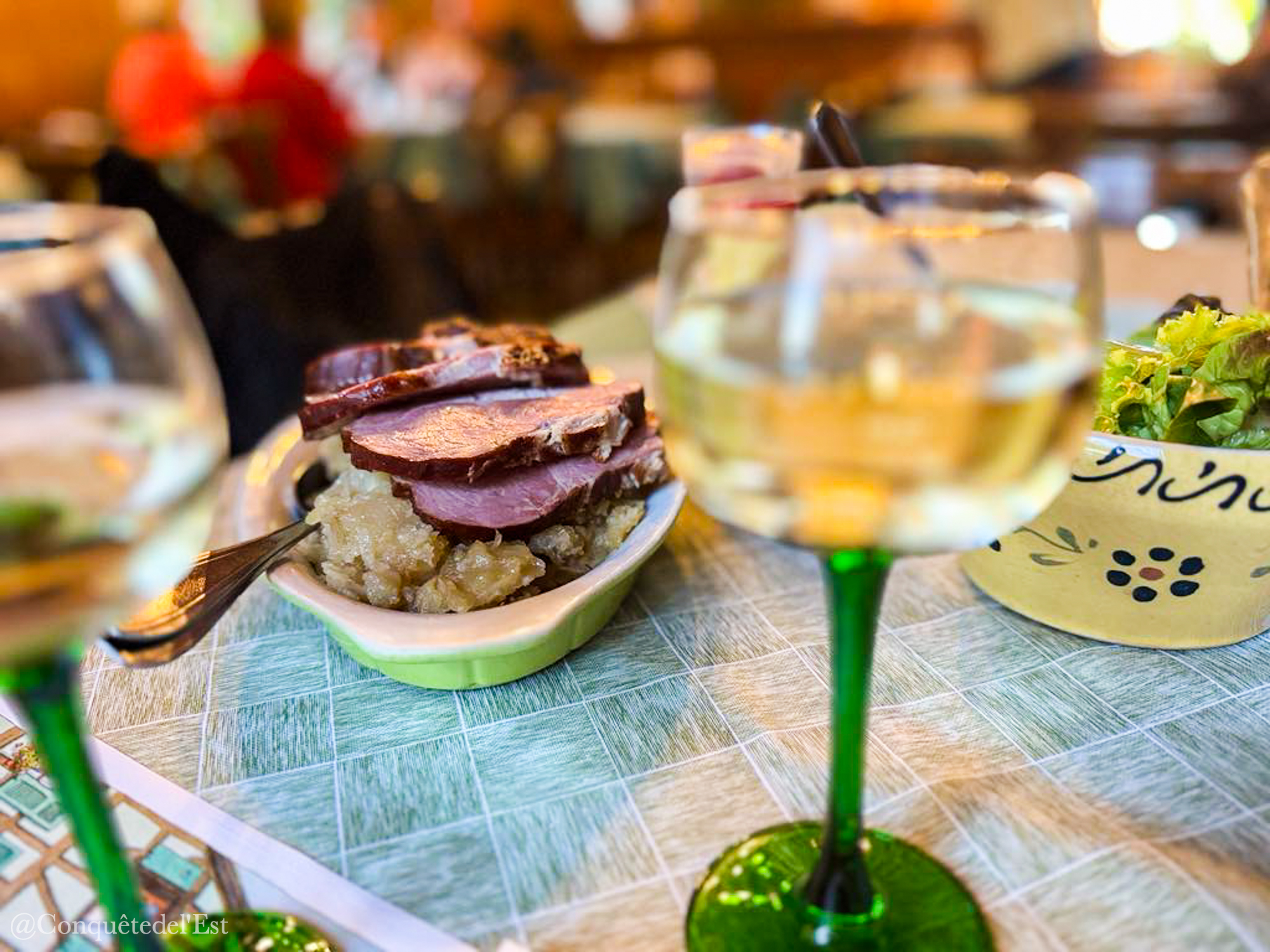 Nous sommes allés manger à l’auberge du Braunkof située à quelques minutes en voiture du chalet. Une vraie auberge familiale dans une ambiance traditionnelle où on vous servira de la vraie cuisine typique alsacienne. On s’est laissé séduire par le menu marcaire avec une tourte en entrée, un collet fumé et ses Roïgebrageldi (pommes de terre cuites à l’étouffée et ses lardons) et un ptit dessert. On s’est régalés, on adore la tourte (#passiontourte) et ce fut l’une des meilleures qu’on ai mangée. Le tout avec un bon ptit vin alsacien, on a passé une super soirée. Arod a, lui aussi, adoré le collet fumé 😉