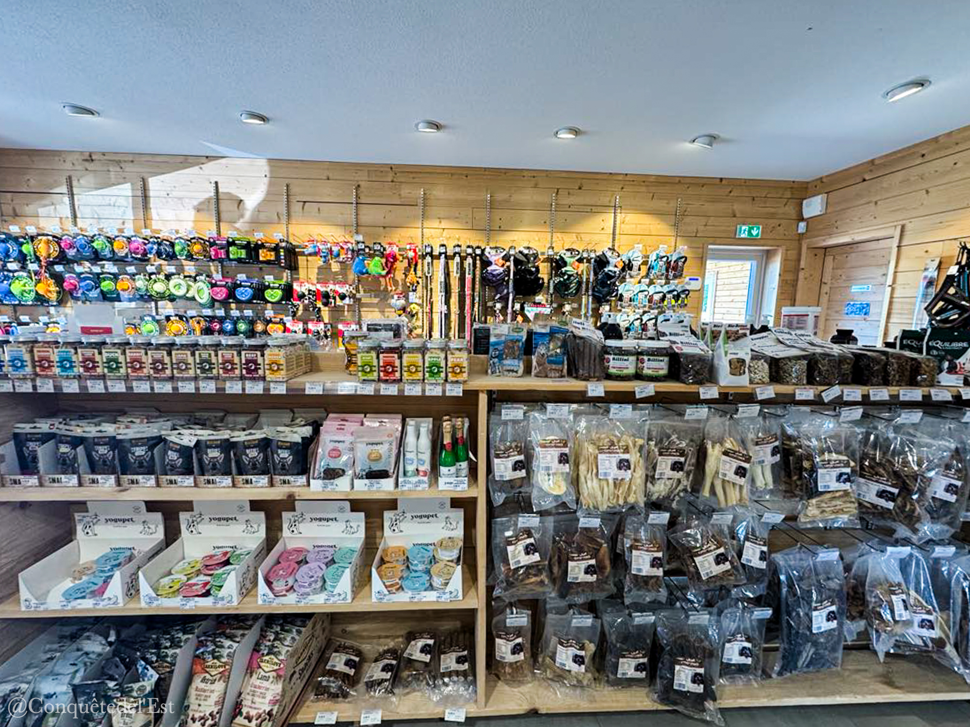 On a poursuivi par la découverte d’un complexe entièrement dédié aux chiens à Whir-au-Val, juste à côté de Munster également. Cyno’val est une boutique spécialisée pour les chiens. On y retrouve les accessoires tels que les laisses, harnais, jouets, mais aussi un rayon très intéressant sur la nourriture canine avec la découverte de marques allemandes et françaises. Arod a pu gouter des friandises de la marque Bellando et il les a adorés (va falloir qu’on revienne faire le stock !). On y trouve des choses plutôt surprenantes comme des smoothies ou même du faux champagne pour nos toutous. C’est là qu’on se rend compte de l’ampleur qu’on prit nos animaux dans nos vies ces dernières années quand on voit le panel incroyable de produits leur étant destinés. Le magasin est tenu par Magali et Emilie qui sont d’excellents conseils (l’une étant éducatrice canine et l’autre assistante vétérinaire). Juste à côté se trouve EMP Trained Dog qui est une pension canine ouverte toute l’année mais, sa particularité, elle peut accueillir des chiens à la journée ou demi-journée. Et ça, c’est vraiment intéressant si vous avez des visites ou activités où, malheureusement, le chien ne peut venir. Des terrains sont adjacents pour venir faire du travail avec votre chien ou le faire se défouler. Il y a également une toiletteuse et, à terme, les filles aimeraient d’autres concepts autour du chien pour agrandir le complexe.