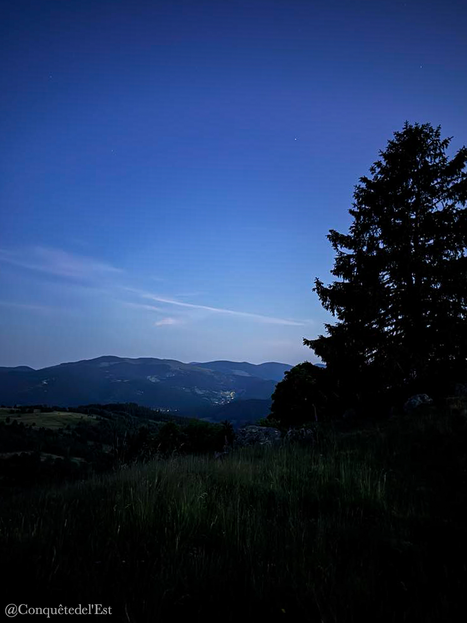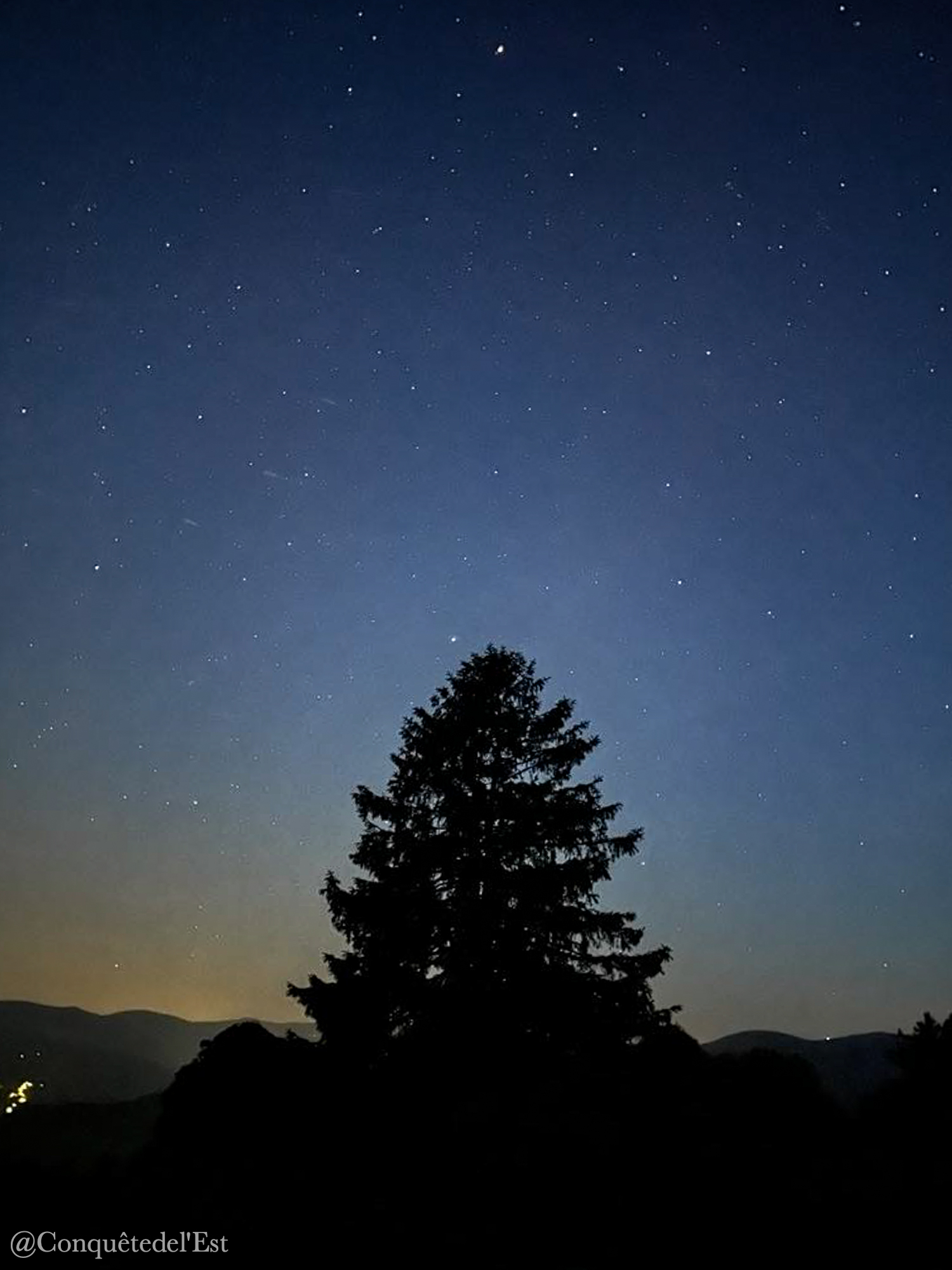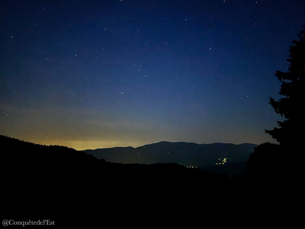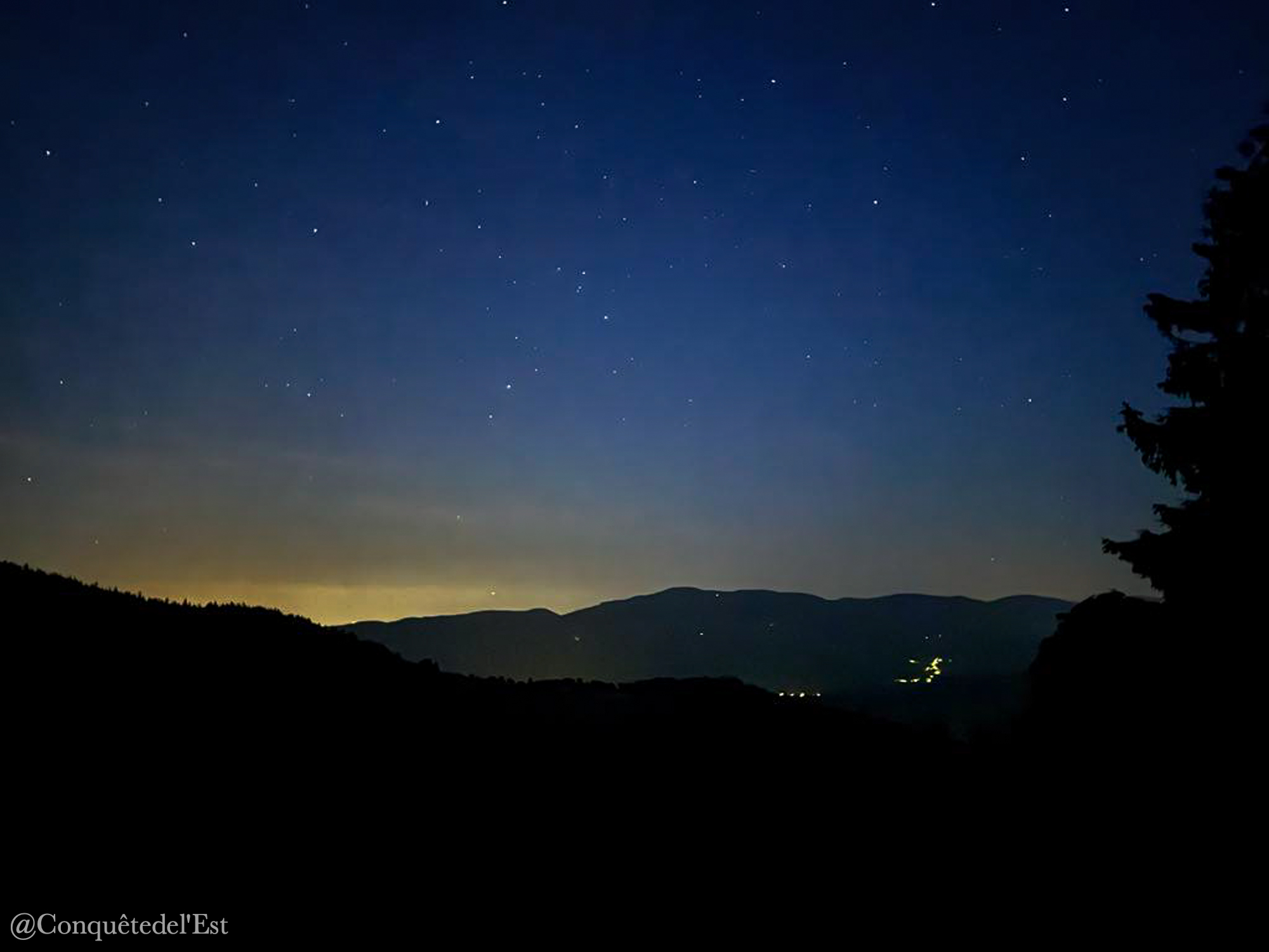 Le soir, pas de repos pour les braves ! On a eu la chance de pouvoir faire une expérience insolite où Arod a pu venir avec nous. Nous voilà parti à 22h rejoindre Joseph de Sepparla. Il est accompagnateur de randonnées et propose des randos thématiques comme celle qu’on va faire : une rando astronomie ! On marche un peu en forêt avant de rejoindre une prairie en hauteur afin d’avoir le meilleur ciel dégagé possible. L’avantage de la vallée de Munster, il y a très peu de pollution lumineuse le soir. Nous voici donc assis sur nos ptits tabourets à regarder les étoiles.