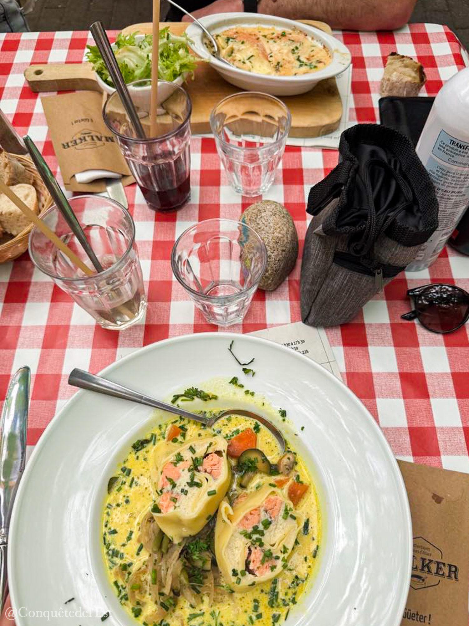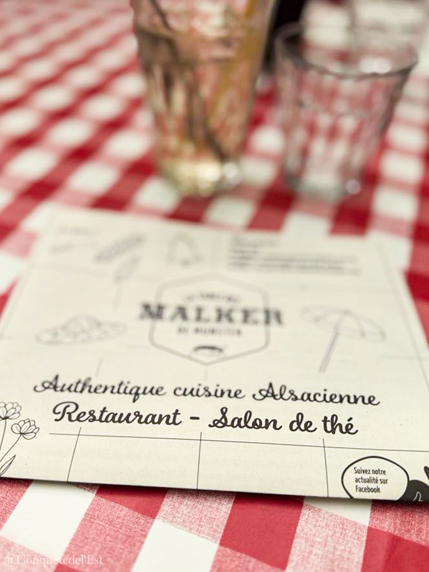 On est allé, ensuite, manger à la Table des Malker au centre de Munster. Un restaurant qui est dog-friendly que ce soit à l’intérieur ou en terrasse. D’ailleurs, Arod n’était pas seuls, d’autres copains profitaient de la superbe terrasse derrière le restaurant. Qu’est ce que j’aime ces terrasses avec des pergolas naturelles. Ici, on est bien en Alsace puisque ce sont des vignes qui nous font de l’ombre ! Dans ce restaurant, tout est représentatif de la gastronomie de la vallée de Munster et quasi tout est en circuit court. C’était, d’ailleurs, dur de faire un choix, tout avait l’air si bon ! On s’est laissé tenter par un gratin de spaetzles au munster bien évidemment et des fischschnakas de truite avec une sauce au safran d’Alsace et légumes. On s’est régalés ! Un très bon accueil en prime.