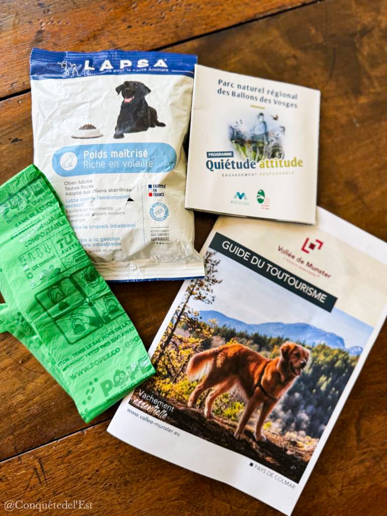 Connaissez-vous, d’ailleurs, le label Toutourisme ? Crée en 2007 par l’office de tourisme de Troyes et qui permet aux propriétaires de chiens de connaître les lieux qui les accueillent et, ainsi, planifier vos visites le plus sereinement possible. L’office de tourisme de Munster est le seul en Alsace à avoir ce label. Dès votre arrivée, vous serez accueilli par un toutoubar et on vous donnera un sac qui contient des friandises, des sacs pour ramasser les crottes du toutou, une brochure sur le programme quiétude Attitude pour connaître les bons gestes pour préserver la faune et la flore locale. Il y a aussi un super guide fait par l’office qui référence tous les lieux accueillants nos amis à 4 pattes (musées, fermes auberge, restaurants, magasins spécialisés..) mais aussi une liste de vétérinaires et les endroits pour les rafraichir, car on connait trop malheureusement les risques que peuvent provoquer les cyanobactéries de plus en plus nombreuses dans les lacs. Vraiment, bravo pour le travail fourni, il est super complet et très utile !