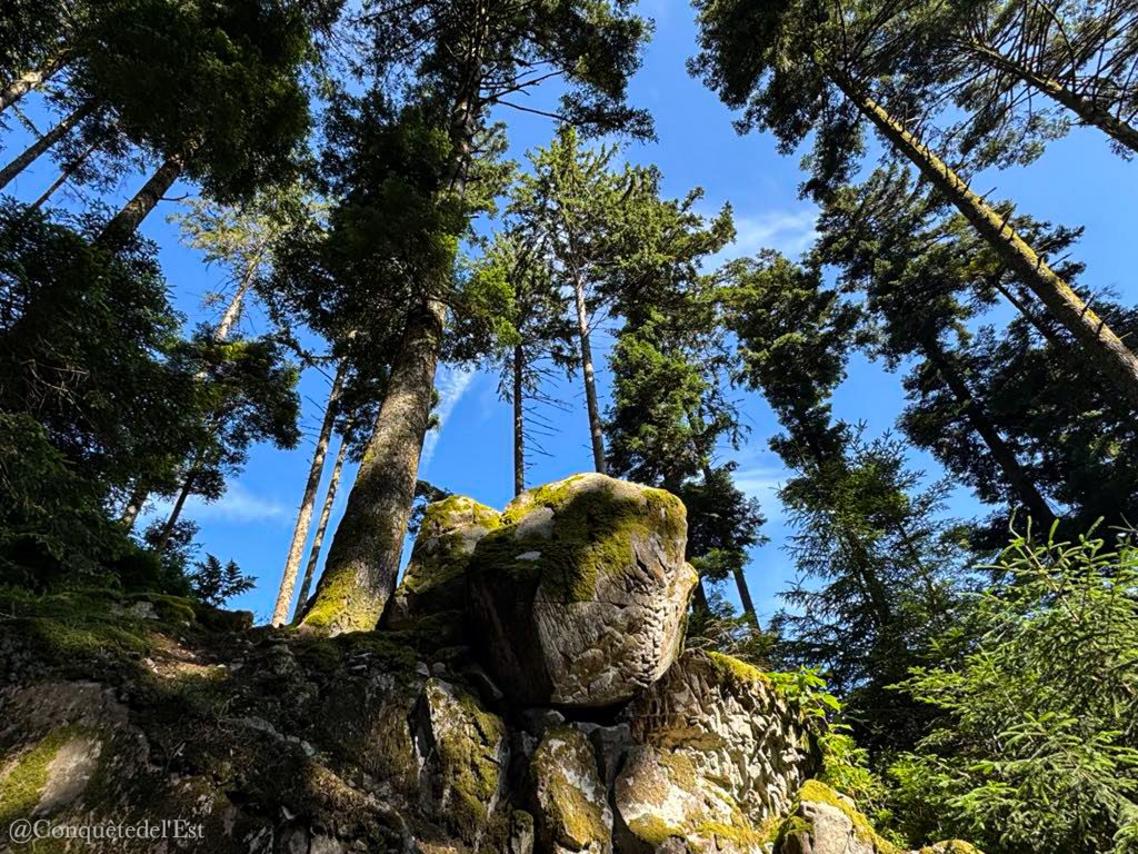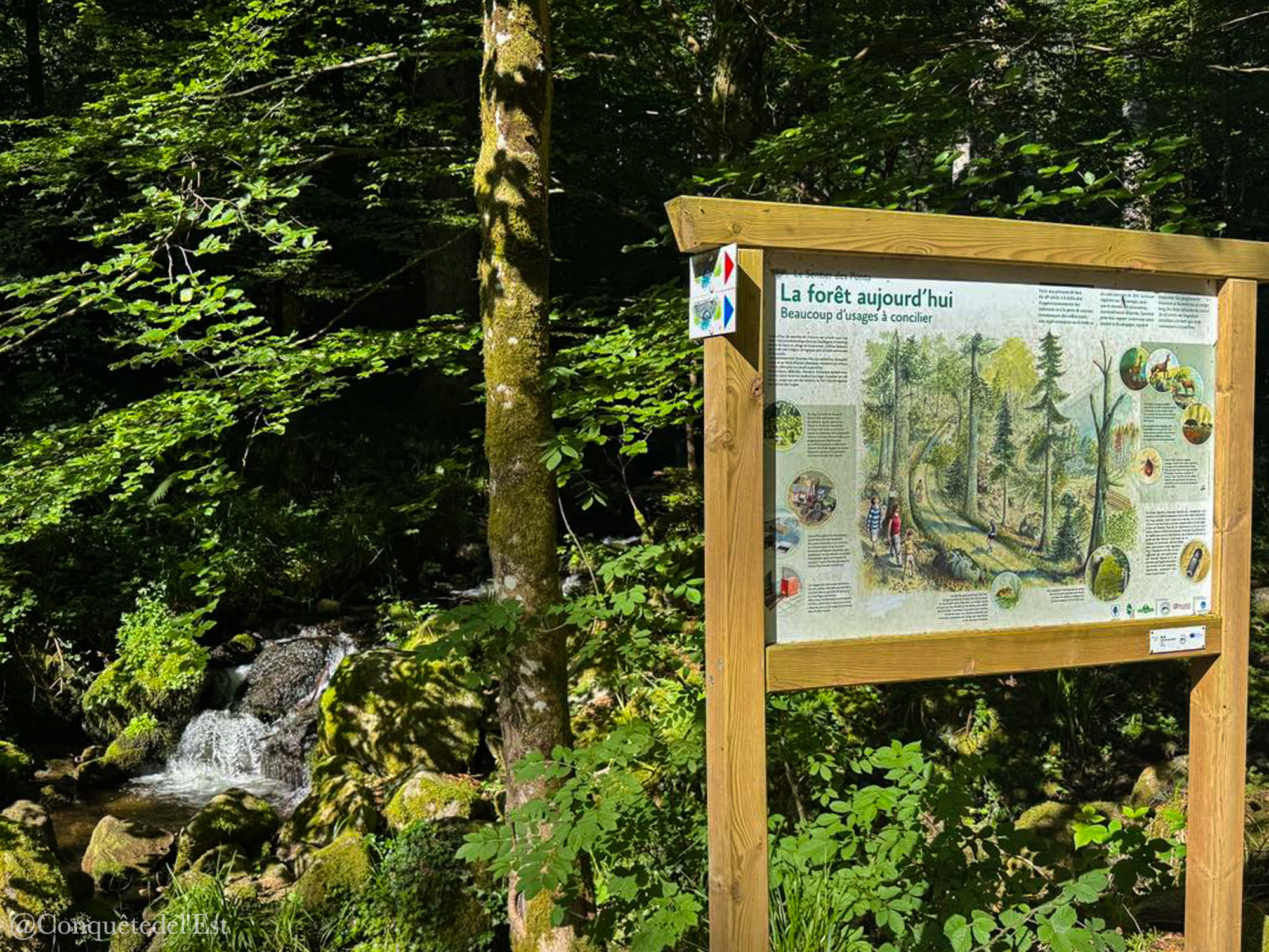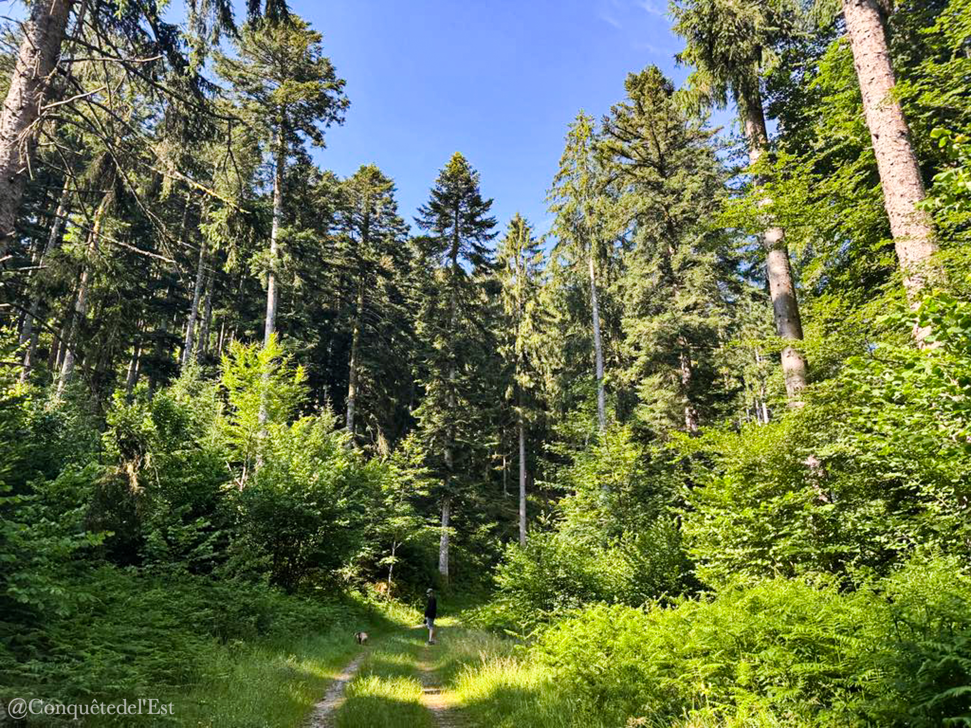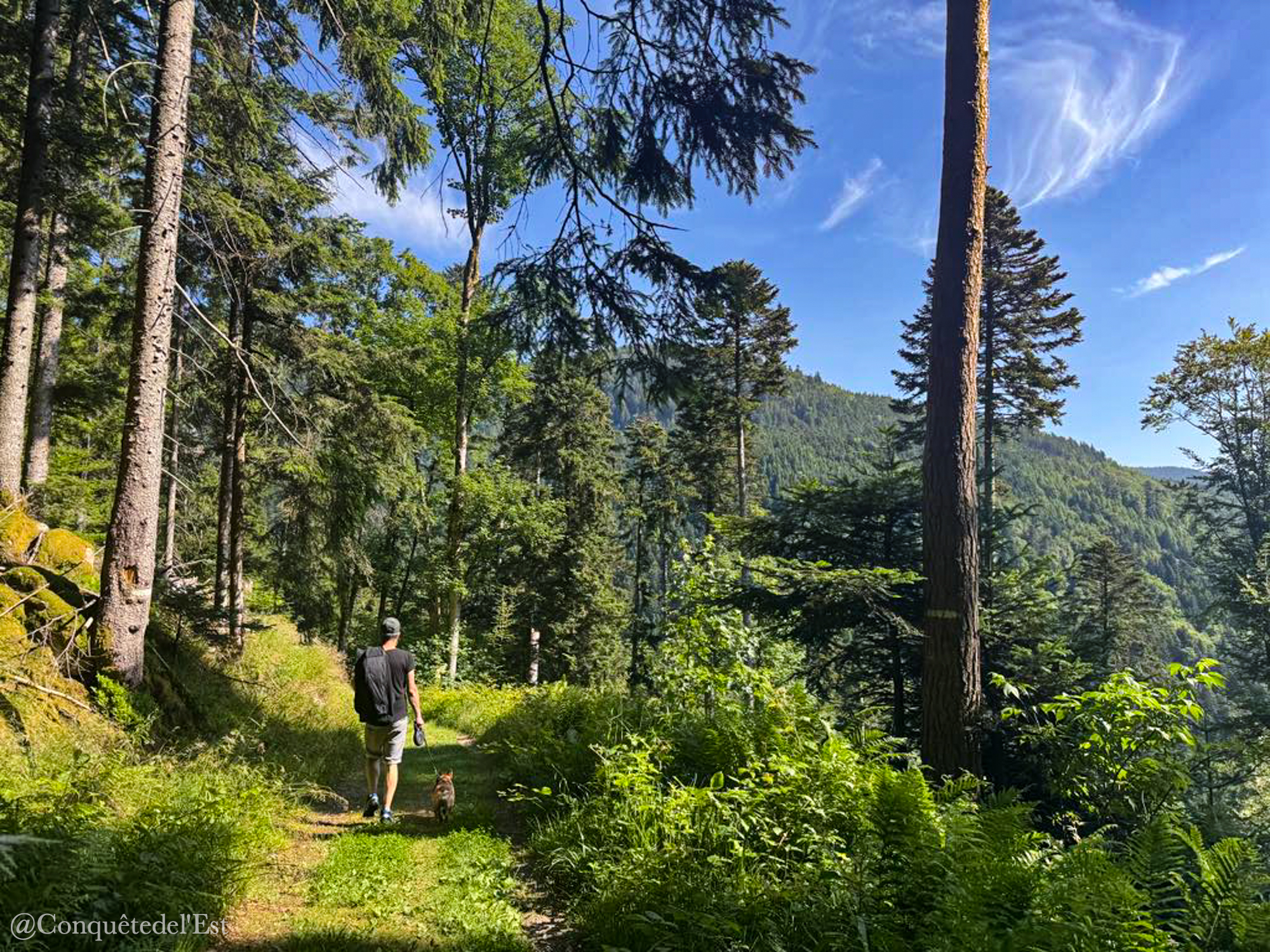 Depuis le chalet, il y a plein de départs de randonnées. Nous en avions demandé une qui serait adaptée à un ptit bouledogue donc pas très longue (ce ne sont pas des chiens sportifs mais qui aiment bien marcher quand même) et assez à l’ombre. Nous sommes donc allés jusqu’à Stosswihr faire une petite randonnée d’un peu moins de 5km, parfait donc ! C’est le sentier des cascades du Stolz Ablass que nous allons faire. Une fois garés sur le parking, vous verrez sur le panneau explicatif que vous avez 3 possibilités de randonnées selon votre envie/niveau. Nous avons choisi de suivre le circuit rouge qui correspond au tracé de Visorando. Franchement, balisage au top, impossible de vous perdre. La randonnée alternera passage en forêt et sentier avec points de vue. Mais le top, c’est de suivre les cascades. Ce sentier caillouteux est bien sympa, il aura fallu porter une ou deux fois Arod car les cailloux étaient plus hauts que lui mais il a adoré découvrir la grimpette, il était comme un fou, un nouveau terrain de jeu super pour lui ! Bon, il n’était pas très courageux pour aller tremper ses pattes dans l’eau mais sachez que vous pouvez laisser votre chien allez se baigner en toute tranquillité dans la Fecht, elle n’est pas polluée aux cyanobactéries. Il y a donc un peu de grimpettes dans cette petite randonnée mais elle est vraiment accessible. Après avoir longé les cascades, on aura droit à un sentier avec de magnifiques points de vue. On reviendra ensuite tranquillement à notre voiture. Ce fut une très belle mise en jambes pour attaquer la journée !