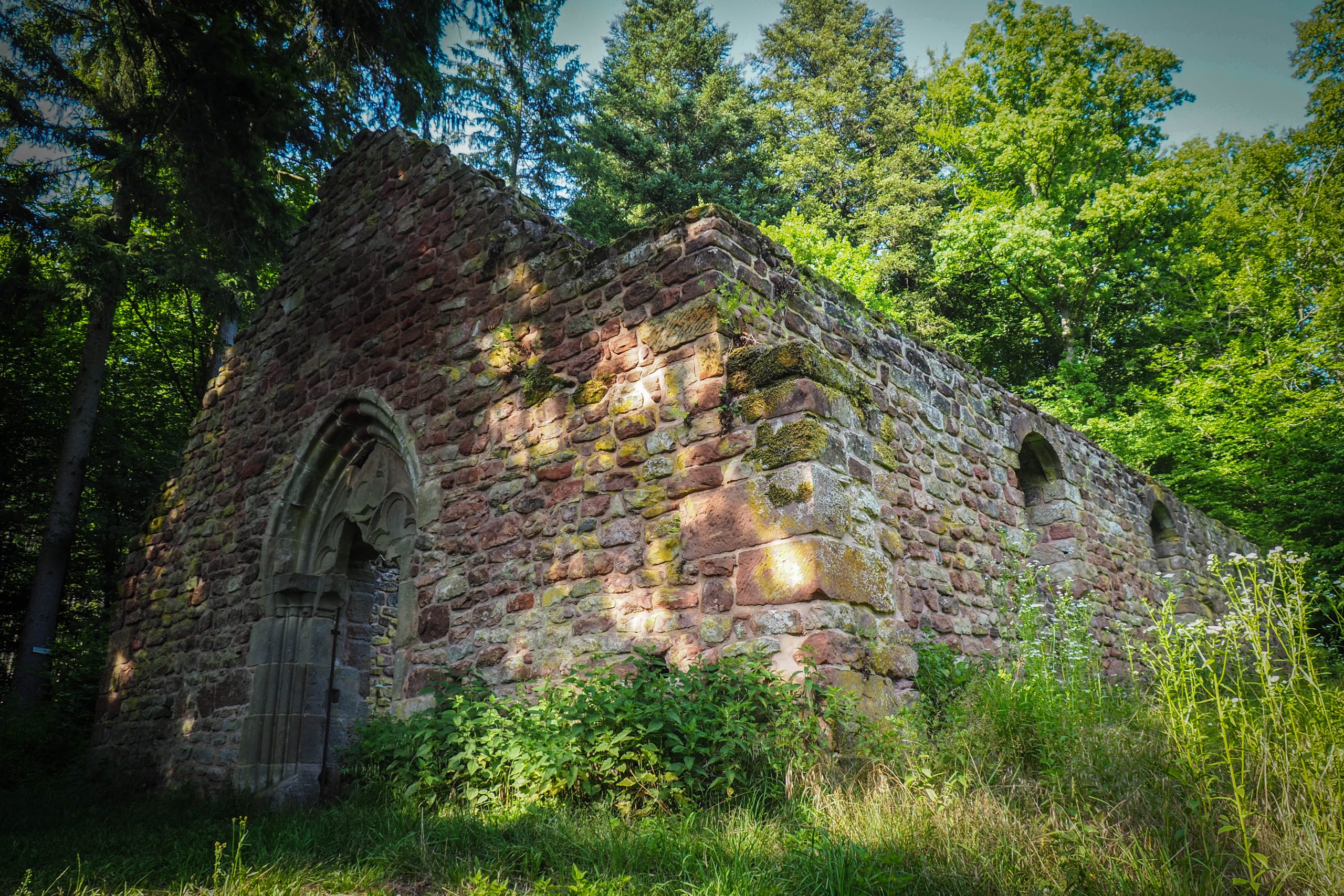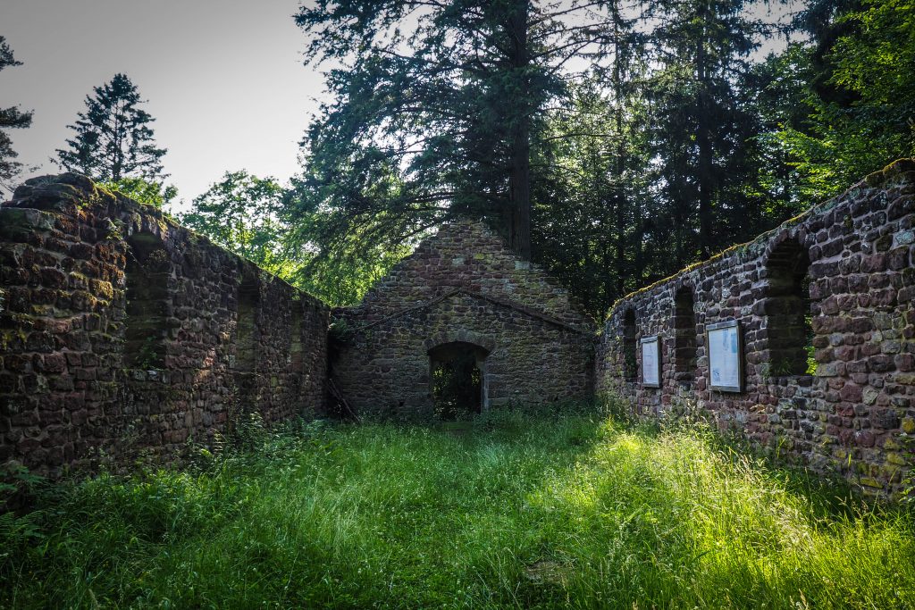 Les ruines sont accessibles via un chemin forestier facile en quelques minutes seulement, mais plusieurs circuits de randonnées sont aussi proposés autour. Faute de temps, nous avons emprunté le chemin le plus direct mais ça n’enlève rien à la magie du lieu, qui fait l’objet de plusieurs légendes ! Dernier vestige de l’ancien village de Birsbach, la chapelle en grès rose trône au milieu de la forêt. La porte gothique est sublime, et même s’il ne reste plus grand chose du bâtiment, on pourrait presque sentir une énergie différente ici !