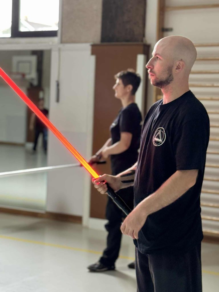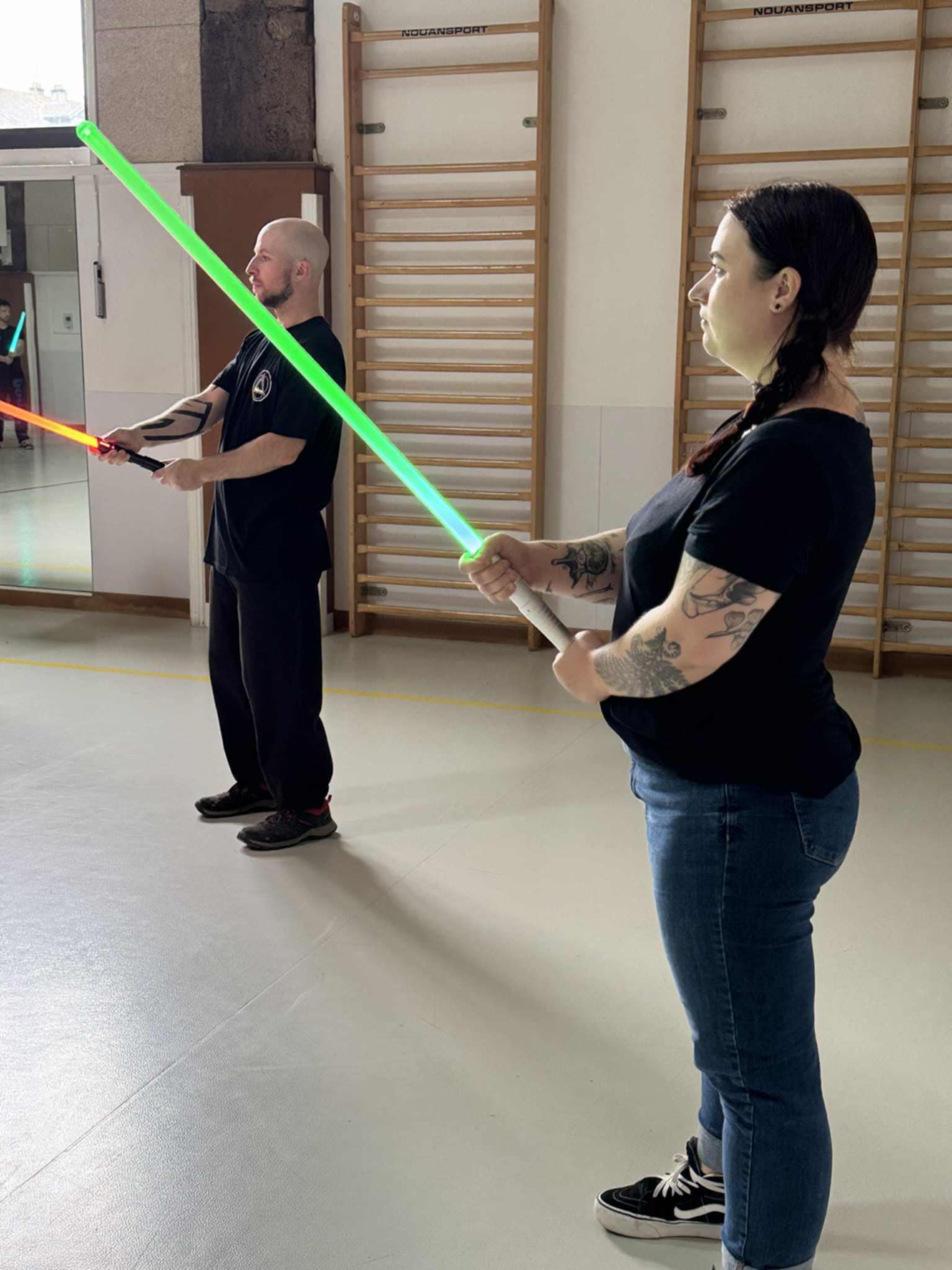 Nous voila dans le gymnase de la Maison de quartier des Forges un dimanche matin avec une belle équipe de gens motivés et passionnés, sans trop savoir ce qui nous attend. Première étape, échauffement ! Un peu de footing, pas chassés, quelques exercices pour faire monter le cardio et faire chauffer les articulations. Ensuite, on révise (ou on apprends, suivant le niveau), les pas de base : déplacements glissé, marche, frappes et gardes. On comprend vite que ça demande énormément de concentration : synchronisation des mouvements, mémorisation des gardes et des frappes, c’est autant une gymnastique mentale que physique ! MAIS il faut bien admettre que faire tournoyer son sabre laser avec aisance c’est sacrément satisfaisant, et un peu badass.