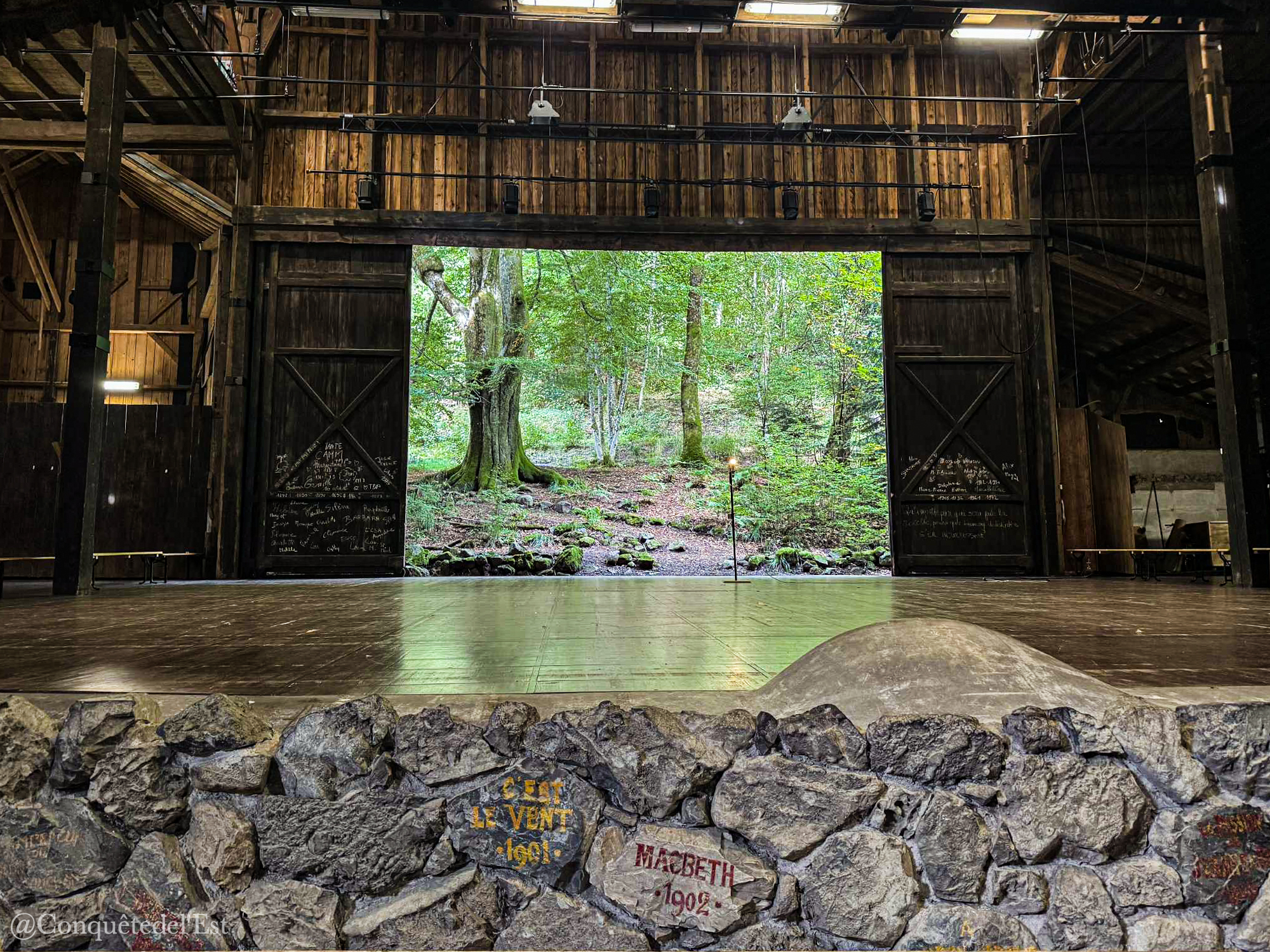 MAIS ! Ce qui fait sa particularité, et que c’est sûrement un théâtre unique au monde, c’est sa structure à l’intérieur. On a dit, il est entièrement en bois, du bois partout ! Et, parfois, souvent, ses grandes portes tout au fond de la scène…. s’ouvrent…. sur la forêt derrière le théâtre ! C’est d’une beauté sans nom quand elles s’ouvrent. On était tous d’accord pour dire qu’aucune vidéo ou photo ne saurait retranscrire l’émotion qu’on a pu ressentir à ce moment-là ! Je vous souhaite tellement de la vivre un jour ! C’est juste incroyable, tellement poétique, tellement enchanteur. Le temps s’arrête, tout s’arrête, on oublie tout. Juste là, ici et maintenant.