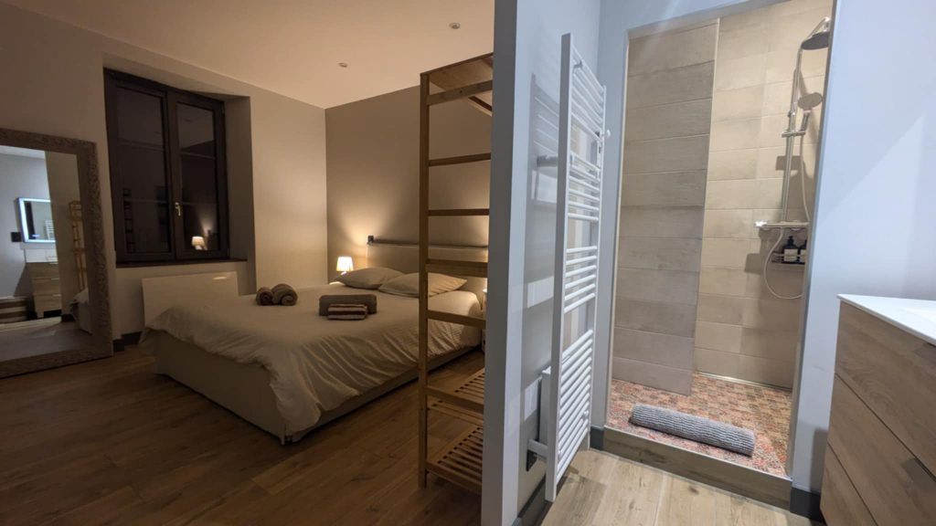 Un escalier à colimaçon vous emmène à la suite parentale à l’étage. Une belle chambre avec lit double et TV, avec la salle de bain juste à côté, avec une douche à l’italienne. Vraiment un chouette endroit pour cocooner !