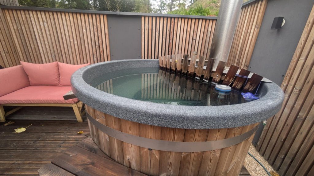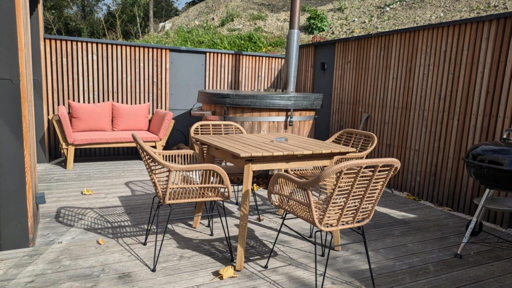 À l’extérieur, un beau bout de terrain et une terrasse pour le barbecue ou pour le bain nordique, le super-bonus qu’on apprécie toujours ! Pour ce bain là, il faut quand même mettre un peu la main à la pâte : c’est à vous de faire le feu qui chauffera l’eau dans laquelle vous allez vous prélasser ensuite 😉 (malheureusement la météo n’était pas avec moi et je n’ai pas pu tester, vous me raconterez ?).