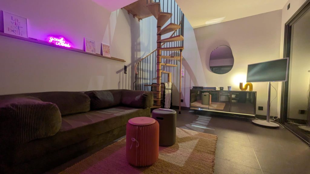 La maison fait 55m2, et les espaces sont organisés de façon à ce qu’on ait l’impression que c’est bien plus grand ! Au rez-de-chaussée, une cuisine hyper bien équipée avec une table haute m’a presque fait regretter de ne pas être venue avec des amis pour se mitonner un petit quelques chose tous ensemble ! À côté, un salon / salle à manger spacieux et hyper lumineux avec les grandes baies vitrées qui donnent sur la terrasse et le terrain. Le encore, très bien équipé : TV, jeux de société ou encore PS4 pour ne pas s’ennuyer ! Moi j’ai profité de la table et de la lumière naturelle pour dessiner une bonne partie du week-end… Le canapé hyper moelleux se convertit en lit si on séjourne à 4 (j’ai noté la référence de ce canapé et maintenant j’en rêve pour chez moi tellement il est confortable).