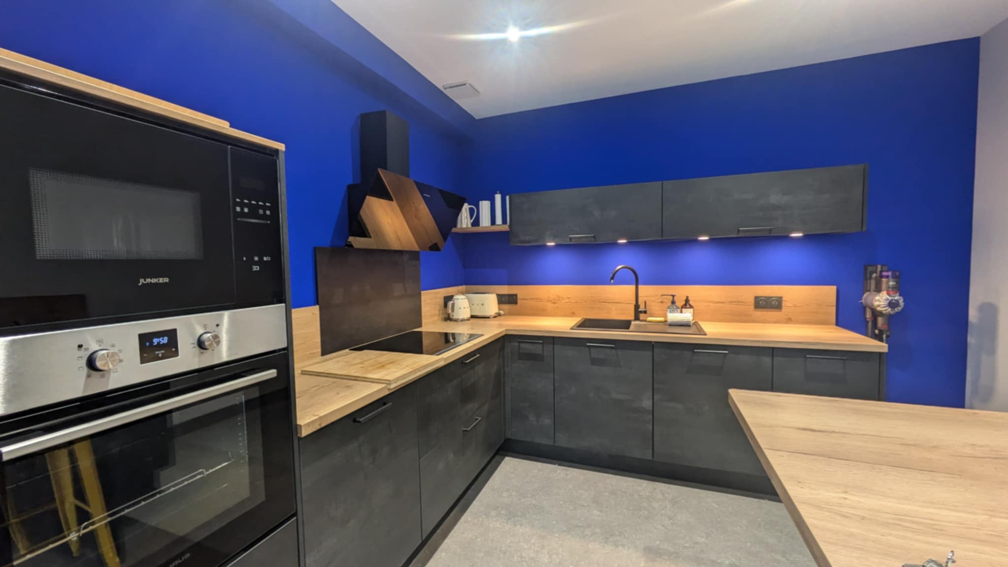 La maison fait 55m2, et les espaces sont organisés de façon à ce qu’on ait l’impression que c’est bien plus grand ! Au rez-de-chaussée, une cuisine hyper bien équipée avec une table haute m’a presque fait regretter de ne pas être venue avec des amis pour se mitonner un petit quelques chose tous ensemble ! À côté, un salon / salle à manger spacieux et hyper lumineux avec les grandes baies vitrées qui donnent sur la terrasse et le terrain. Le encore, très bien équipé : TV, jeux de société ou encore PS4 pour ne pas s’ennuyer ! Moi j’ai profité de la table et de la lumière naturelle pour dessiner une bonne partie du week-end… Le canapé hyper moelleux se convertit en lit si on séjourne à 4 (j’ai noté la référence de ce canapé et maintenant j’en rêve pour chez moi tellement il est confortable).