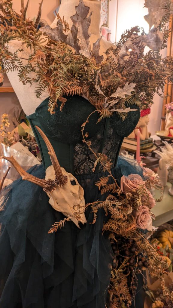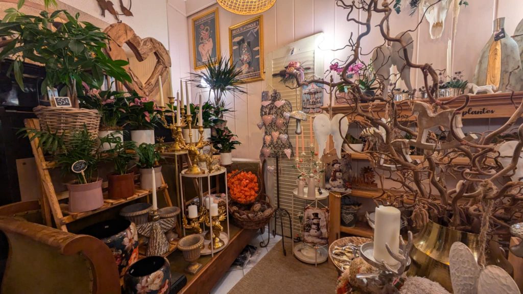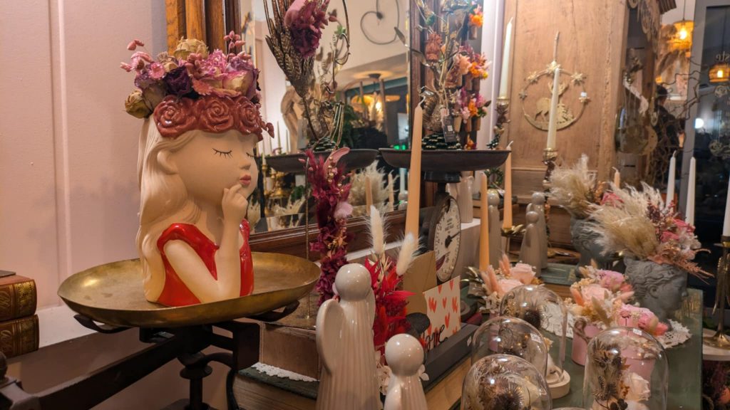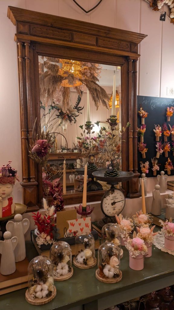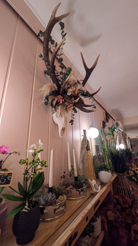 Elle se démarque par le choix de ses articles de déco, mais aussi par ses valeurs et la volonté de ne pas travailler des fleurs de façon non éthique. Ainsi, chez le brin créatif, on y trouve des fleurs qu’on ne voit pas partout ailleurs (exit les traditionnelles roses rouges et blanches ou les lys), mais plutôt des fleurs de saison et des feuillages originaux. Et pour des compositions plus durable, elle travaille aussi les fleurs séchées et stabilisées ! Je suis tombée amoureuse de sa robe de Noël et de son massacre de cerf exposé dans la boutique !
