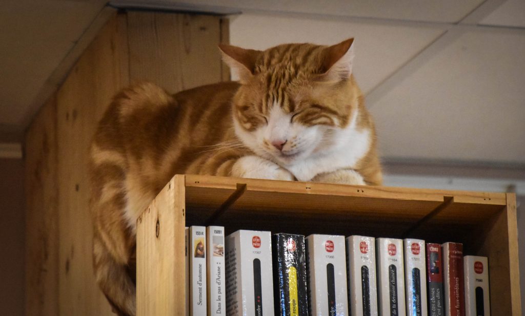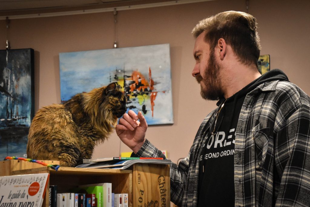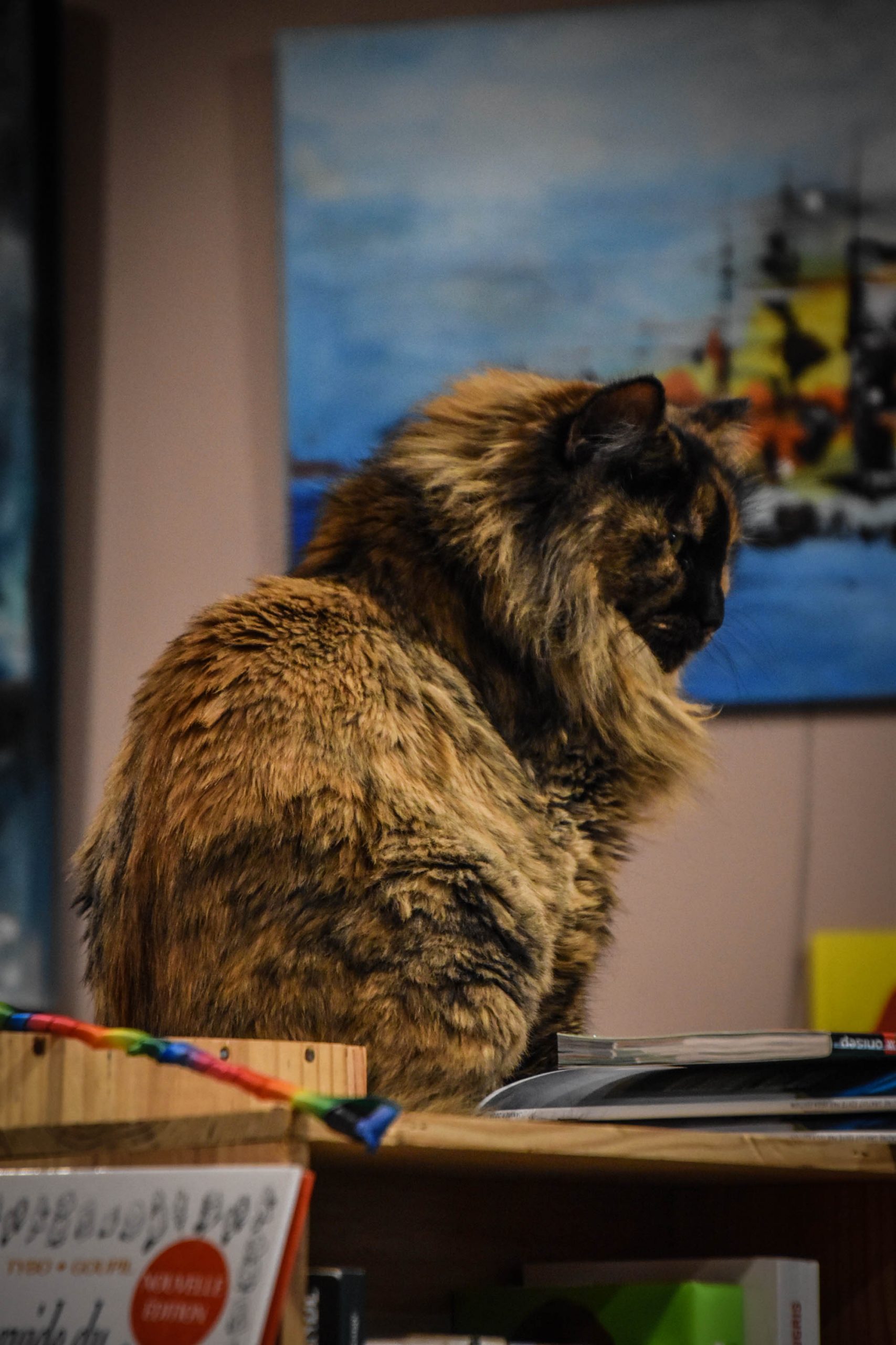 On s’installe autour d’une petite table ou sur un canapé, et on en profite pour commander boissons et douceurs.. On a particulièrement craqué pour les délicieux cookies gourmands préparés par une pâtissière de Saint Nabord. Les chats sont libres de déambuler comme ils le souhaitent, ils ont tous été choisis pour leur caractère sociable, néanmoins, on a toujours plus de chance de les trouver en train de dormir en haut d’une bibliothèque ou entre deux étagères que sur les genoux d’un visiteur ! Si ils le souhaitent, l’arrière boutique leur est intégralement consacrée, ils peuvent donc s’y isoler.
