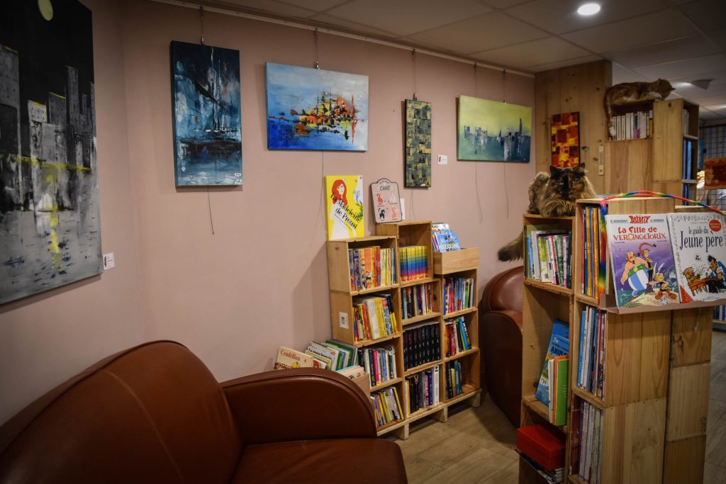 Pattes & Pages, ce n’est pas seulement un bar à chats, c’est un lieu qui regroupe de nombreuses fonctions, le tout, dans le but de soutenir l’association et par extension, le sauvetage des chats ! Le plus flagrant, c’est la librairie : On entre et on remarque de suite les nombreuses étagères richement garnies de romans, de BD, d’essais, de mangas,… Chacun trouvera pour sûr la thématique qui l’intéresse ! Les livres sont pour la plupart à vendre, et pour d’autres, à consulter sur place. Si vous cherchez à débarrasser un peu votre bibliothèque, vous avez possibilité de laisser des ouvrages en don !