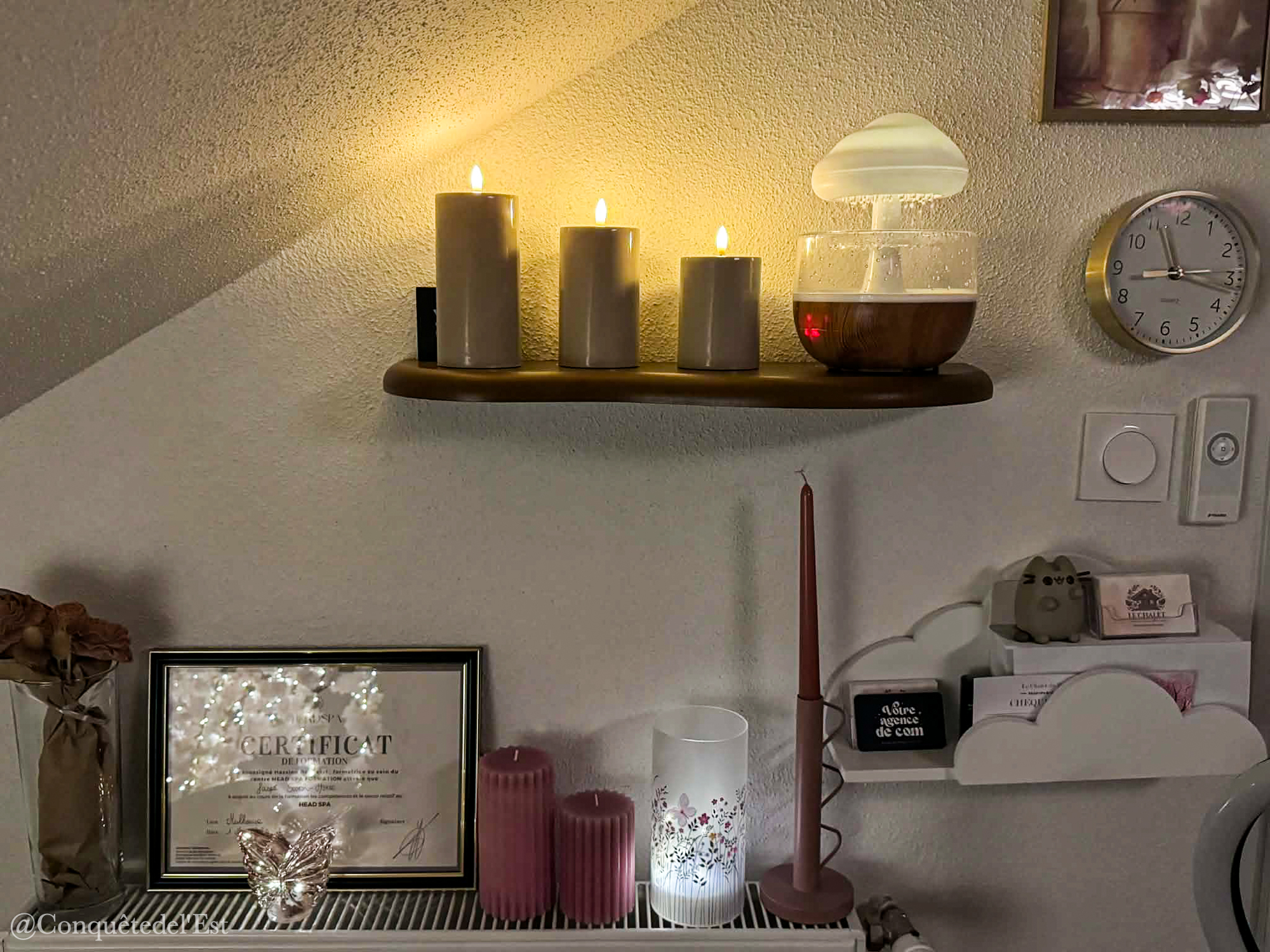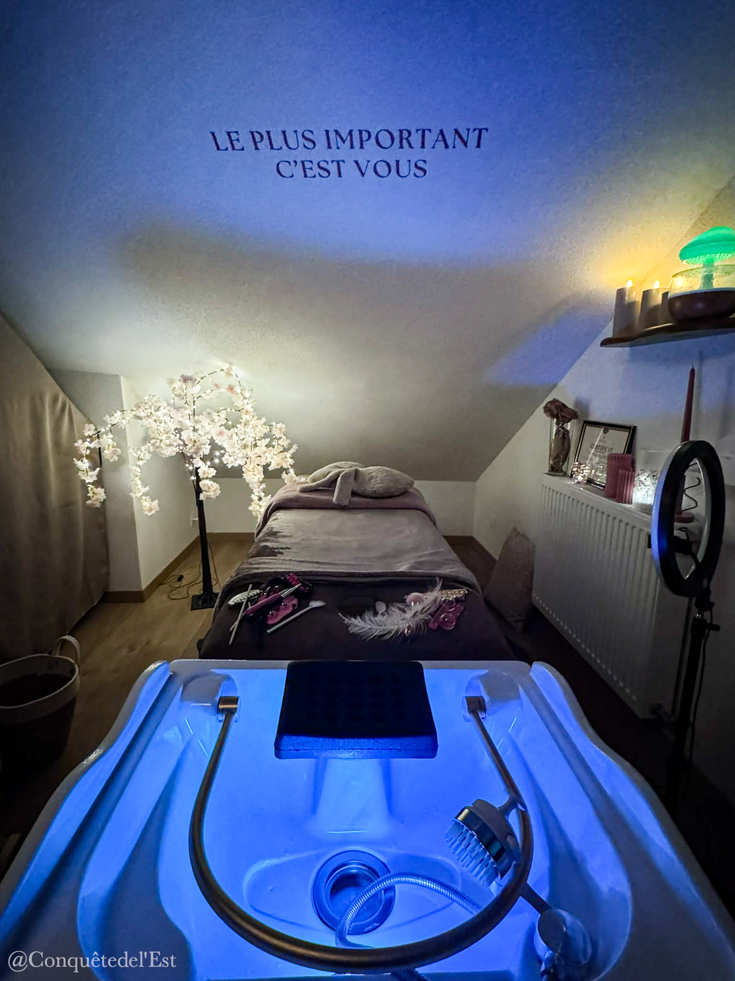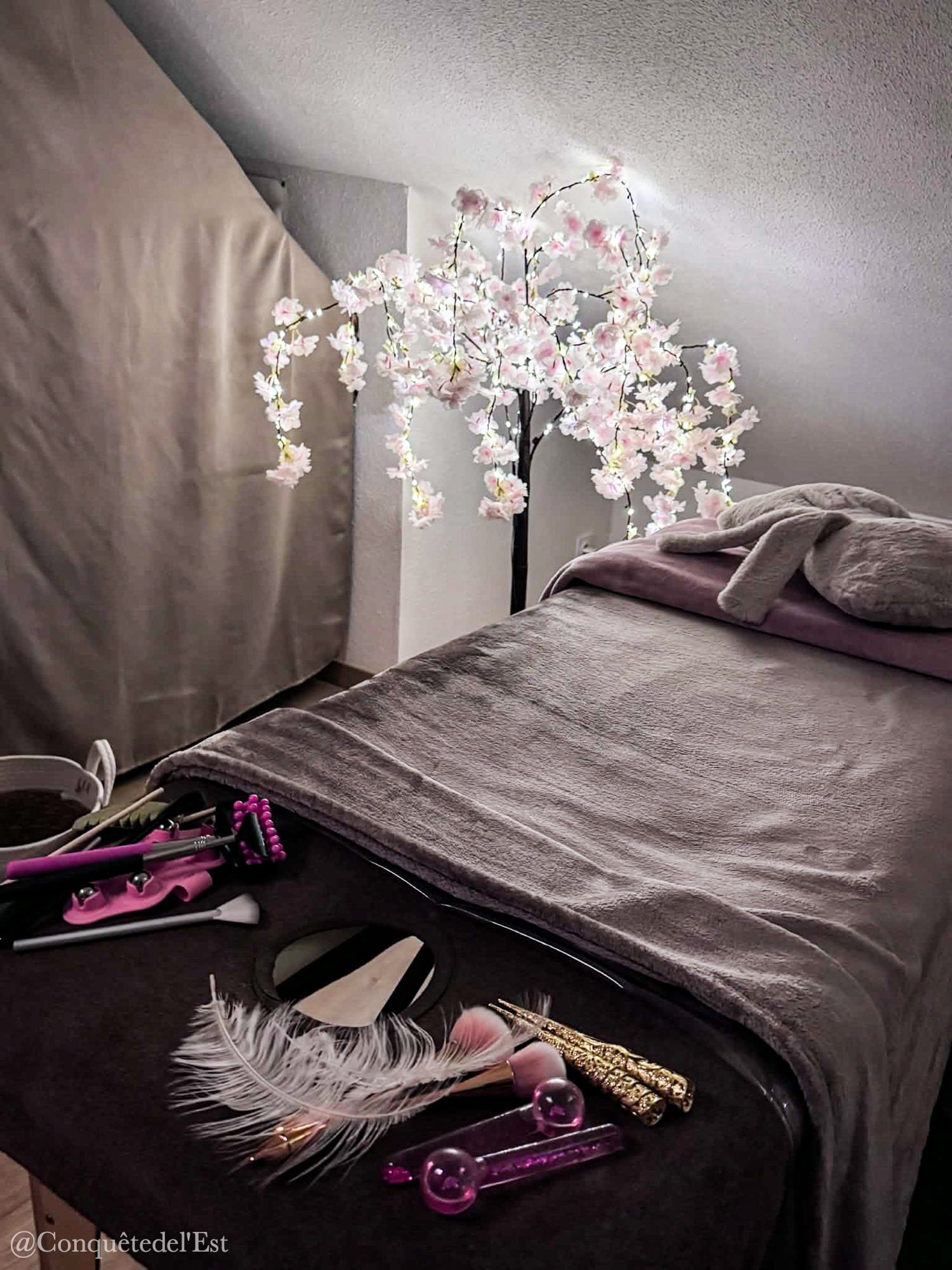 Sarah a investi une pièce chez elle en un véritable cocon dédié à la détente, sous les combles ce qui rend la pièce très chaleureuse. Elle s’est formée seule à cette nouvelle discipline, s’est amusée en achetant elle même des ustensiles pour vous faire de merveilleuses papouilles.