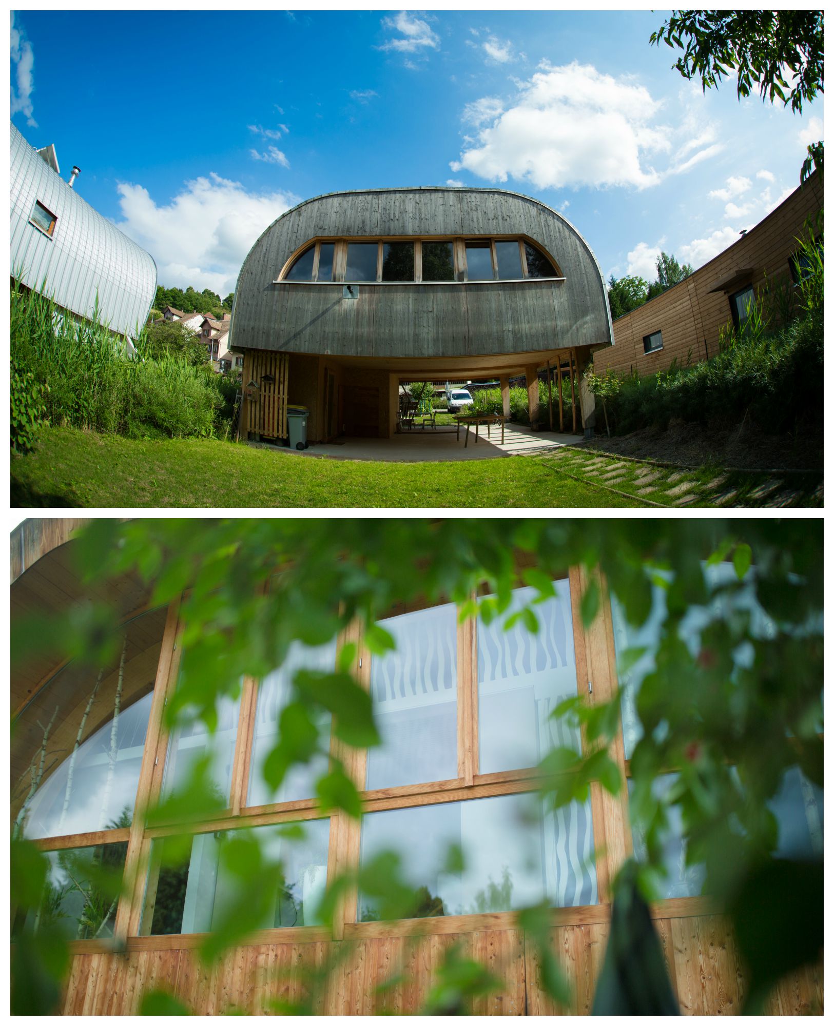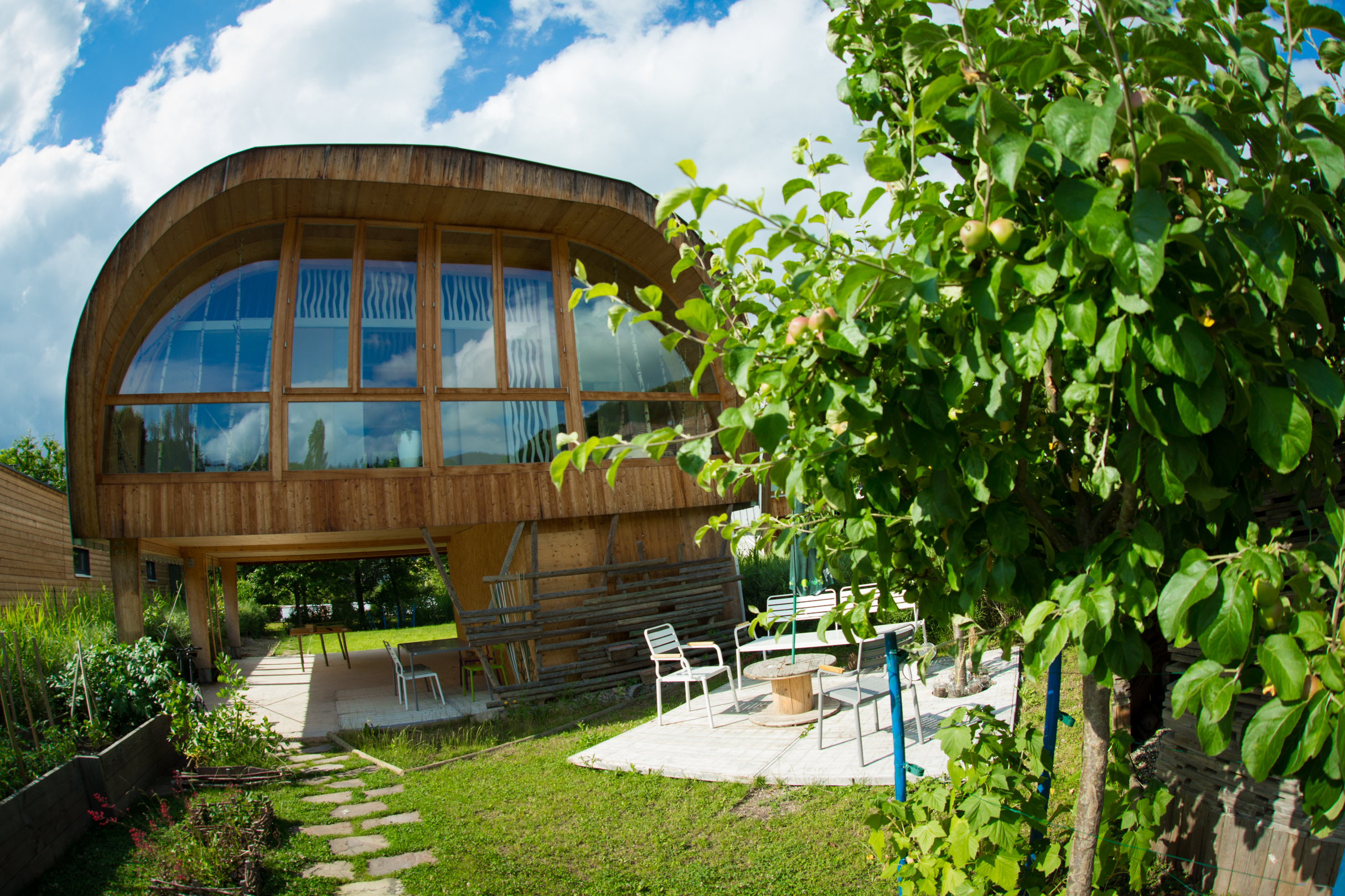 Nous nous sommes donc rendus à Sainte Croix aux Mines, juste à côté de Sainte Marie (aux Mines aussi) pour rencontrer Olivier, propriétaire de ce gîte pas comme les autres. En arrivant nous sommes étonnés de trouver plusieurs de ces bâtiments en bois dans la même rue. Il y a en a en fait 3 dont le gîte, côtoyés par d’autres maisons originales, car il s’agit d’un projet d’écoquartier qui a vu le jour en 2008. (Tous les détails de ce projet est disponible dans la doc du gîte !)