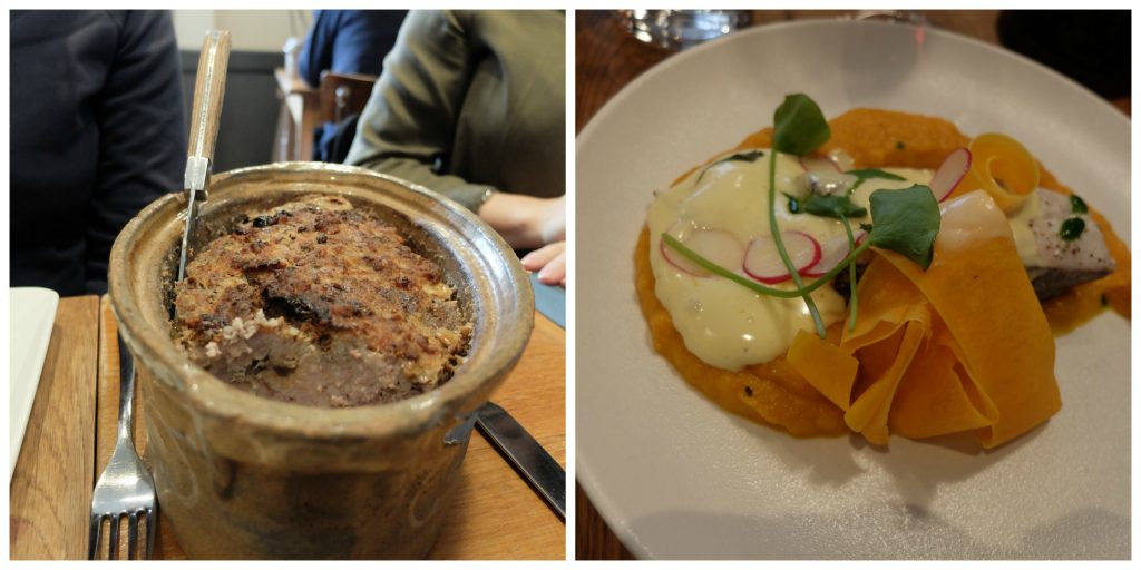 Situé dans le quartier historique de Rennes, ce petit restaurant a tout pour plaire. Artisans restaurateurs, ils ont comme vocation de ne servir que des produits frais et de saison. En effet, une carte réduite en est la preuve. Un menu du jour tout à fait abordable nous ai proposé : entre+plat ou plat+dessert pour seulement 13€. Je me laisse séduire par une terrine de cochon aux noisettes (divine !) et hors de question d’être en Bretagne sans faire le plein de poissons frais, je prend donc un filet de merlu. C’est bon, copieux et très bien présenté (toutes les assiettes ont fait le bonheur des blogueurs qui ont tous dégainés leurs appareils photos !)