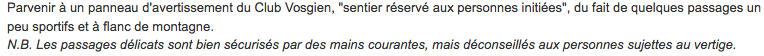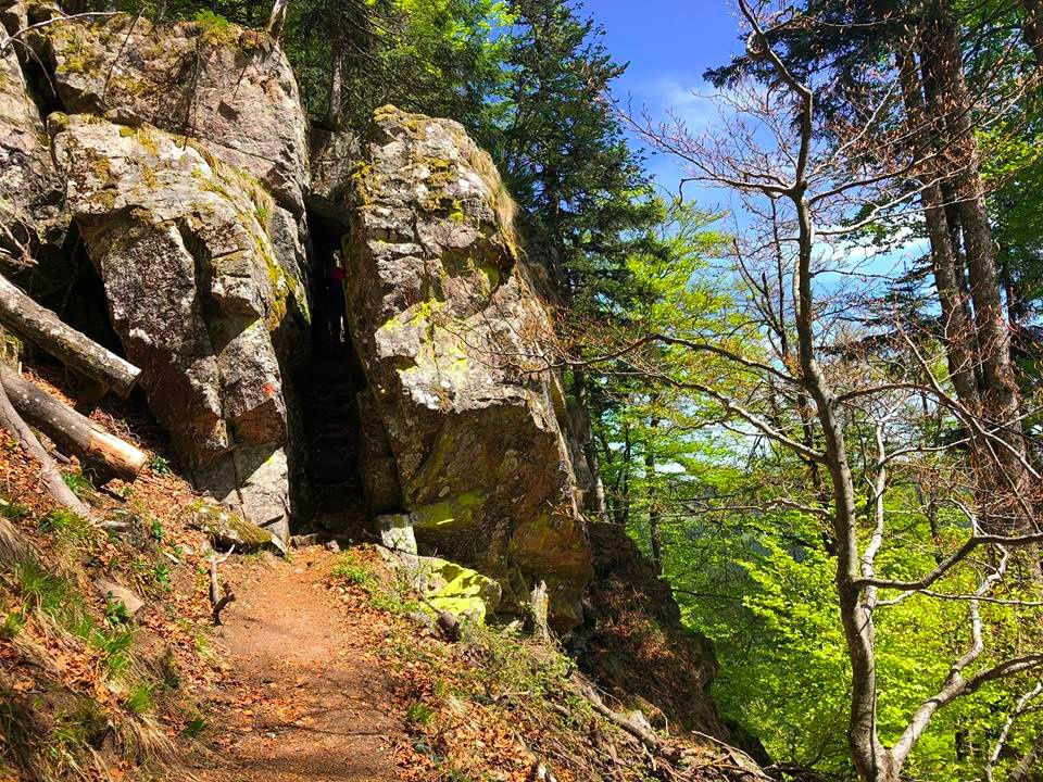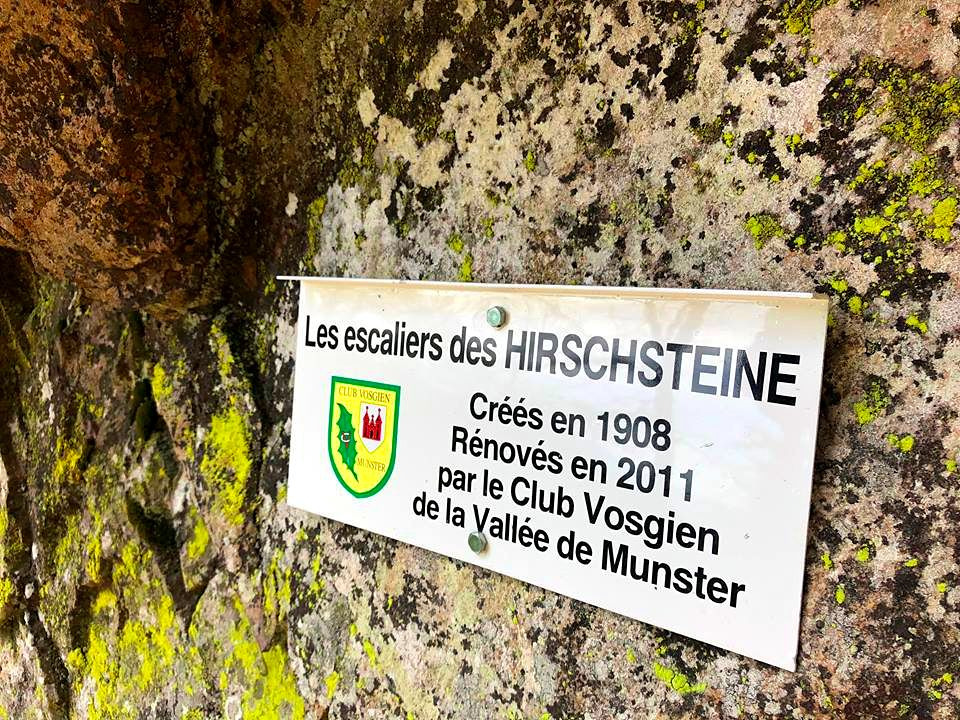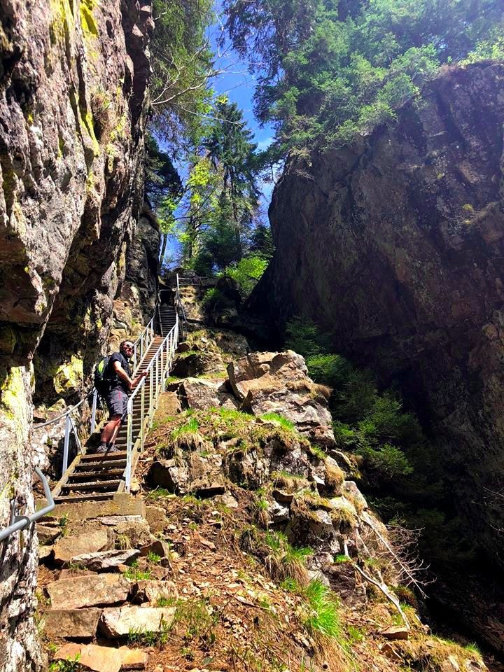 Nous progressons en direction des fameux escaliers des Hirschteine. Nous franchissons un passage impressionnant creusé dans la roche et c’est là que le stress commence. En effet, quand on a lu le descriptif de la rando, on a lu ça :