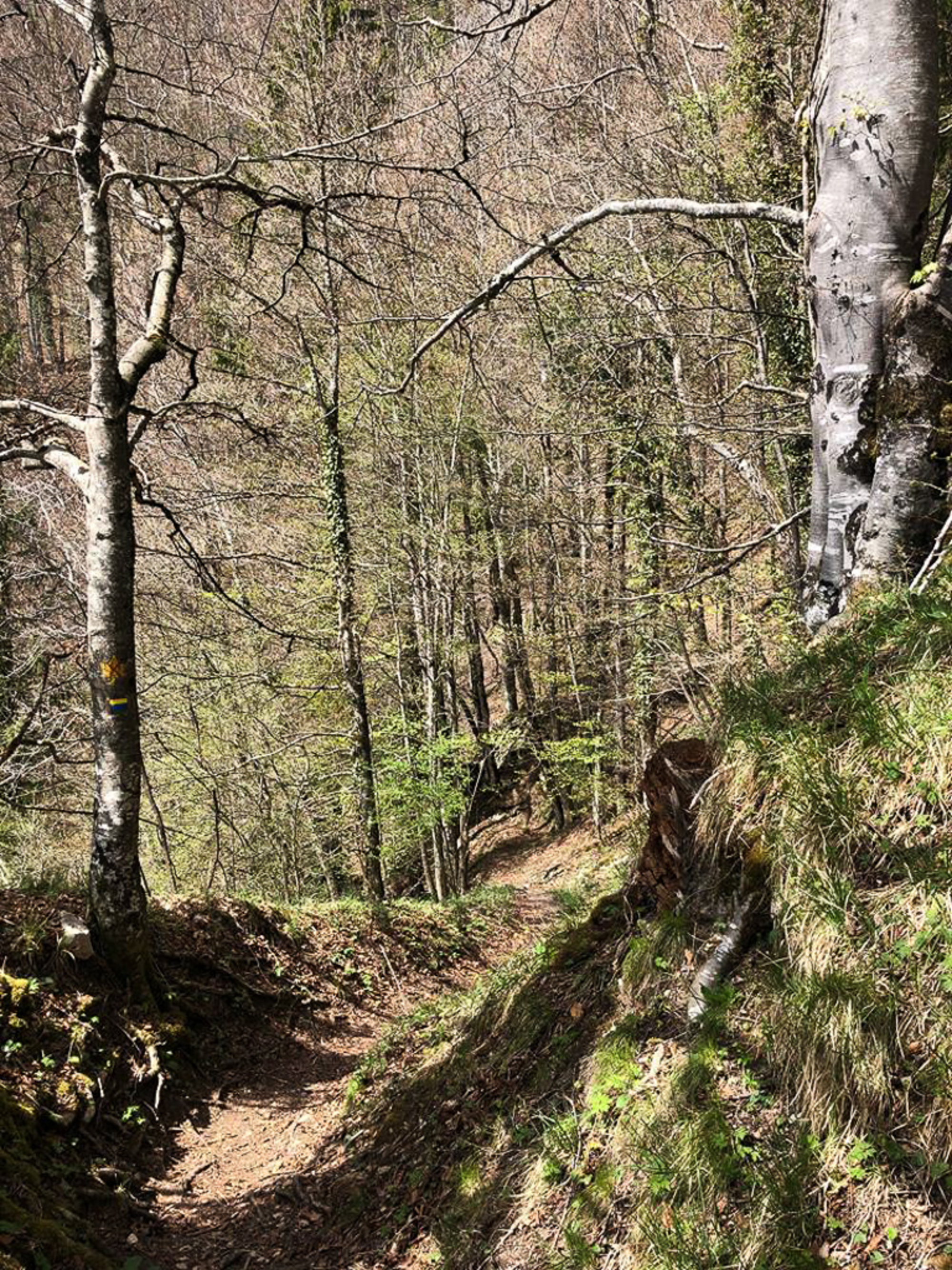 On continue et ça descend ! Ca descend beaucoup, rappelez vous le schéma du dénivelé ! Je déteste les descentes en randonnée, j’ai encore du mal à être confiante, à l’aise et là, mes jambes se tétanisaient car y’avait encore pas mal de feuilles et j’avais peur de glisser. Mais ça, c’est propre à moi ! Quand j’ai vu des gens s’entrainer au trail sur ces chemins là, je me dis qu’il y a très peu de risques 😉