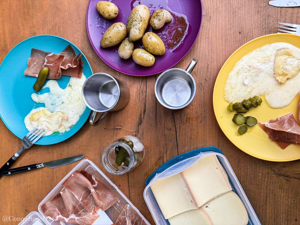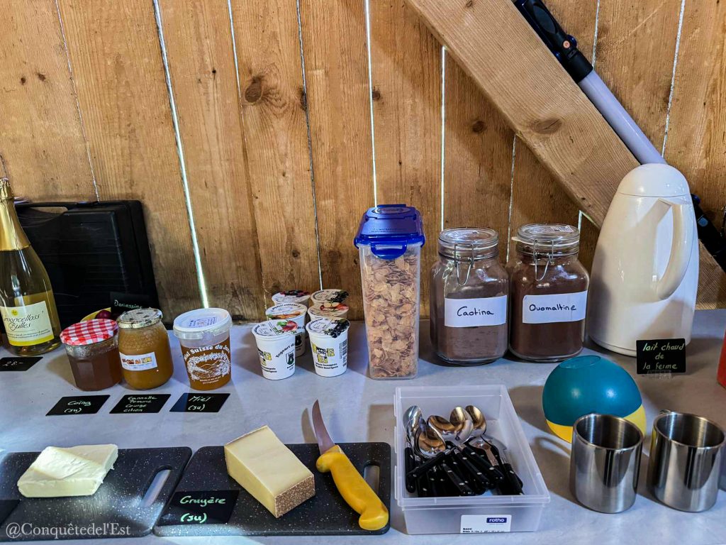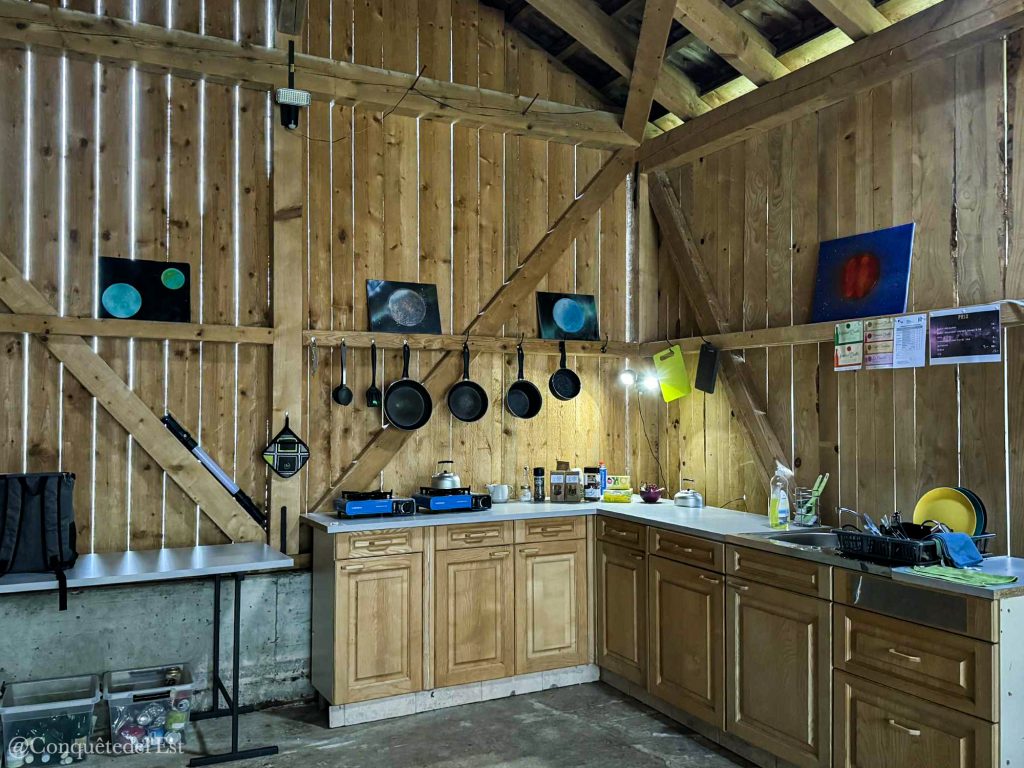 Un peu plus haut, je vous ai parlé de raclette. Normalement, quand on parle de fromage, on a toute votre attention ! Elodie et son marie proposent le soir fondue suisse, raclette ou brochettes car il y a un barbecue. On s’est laissé tenter par une raclette et la raclette au barbecue, c’est validé ! Le fromage vient d’un exploitant à côté de leur ferme et il était incroyable. Un hangar aménagé fait office de salle à manger conviviale, de cuisine et là aussi, le lieu est parfait pour créer du lien.