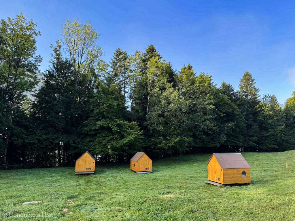 Ours, c’est un concept à lui tout seul. C’est Elodie et son mari, agriculteurs, qui ont eu envie d’aller plus loin que leur principale activité et qui proposent de l’agritourisme. Ils ont installé sur leurs terres des cabanes pas comme les autres !