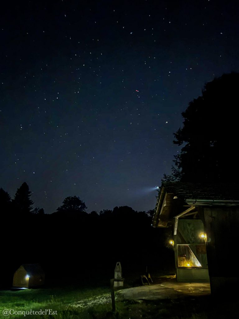 L’endroit accueille les chiens. Arod était au paradis, le parc des cabanes pour lui tout seul et la connaissance avec les chèvres de la maison. Bon, les étoiles, il n’en avait pas grand chose à faire mais nous, on a adoré vivre ce moment avec lui.