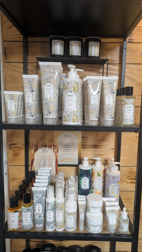 Quand j’arrive au salon, je suis déjà étonnée dès l’entrée. Là où on a l’habitude de trouver quelques produits mis en avant dans les autres instituts, ici, c’est une véritable petite boutique qu’on découvre ! Des bijoux, des accessoires, et même une petite sélection de vêtements : de quoi patienter en faisant du lèche vitrine avant votre soin ! J’ai vraiment aimé les produits proposés, originaux et de bon goût !