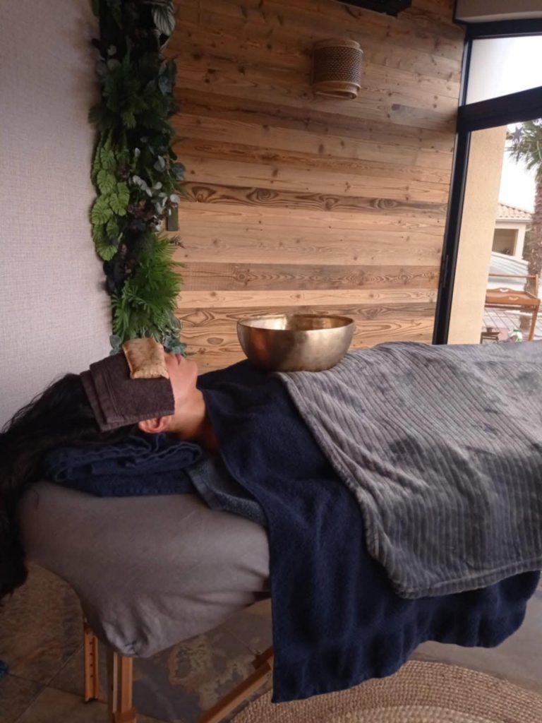 La particularité de ce soin, c’est qu’il mêle plusieurs choses, pas seulement du massage. On commence par de la détente guidée : Sandrine de pose pas tout de suite les mains sur vous, mais vous touche d’abord avec sa voix. Tout en douceur, elle vous emmène dans son univers et vous accompagne dans les premiers pas du lâcher prise. On prend conscience de chaque partie de son corps qu’on relâche une par une progressivement. Et puis une petite touche sonore vient accompagner ça, et pas avec un enregistrement de vague ou de petits oiseaux, mais avec des instruments comme les carillons et les bols tibétains. Elle les manipule autour de nous pour des sensations sonores en 360. Personnellement, le bol tibétain, c’est vraiment un son qui m’apaise efficacement, j’ai adoré les retrouver combinés à un massage !