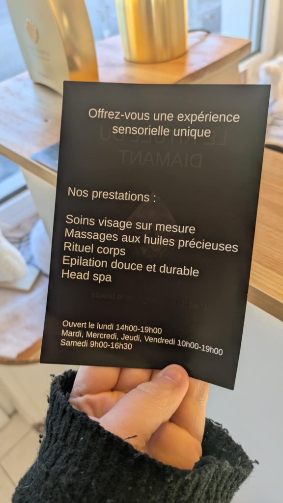 C’est Valentine, qui m’accueille dans son local hyper lumineux, à la déco soignée et sobre. Elle vient tout juste d’ouvrir son propre institut après avoir exercé quelques temps chez elle. La clientèle grandissante, il était temps de trouver un cocon plus grand pour continuer d’accueillir les visiteurs dans de bonnes conditions ! Valentine perfectionne sa formation en esthétique et en massages détente au fur et à mesure de ses voyages, où elle s’inspire et apprends de nouvelles techniques pour façonner ses propres massages signatures. Le diamant, dont le nom est inspiré par sa maman, est son massage phare !