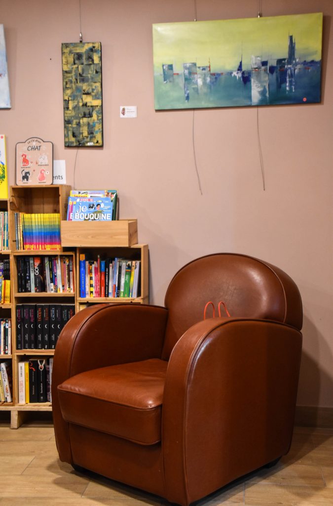 On s’installe autour d’une petite table ou sur un canapé, et on en profite pour commander boissons et douceurs.. On a particulièrement craqué pour les délicieux cookies gourmands préparés par une pâtissière de Saint Nabord. Les chats sont libres de déambuler comme ils le souhaitent, ils ont tous été choisis pour leur caractère sociable, néanmoins, on a toujours plus de chance de les trouver en train de dormir en haut d’une bibliothèque ou entre deux étagères que sur les genoux d’un visiteur ! Si ils le souhaitent, l’arrière boutique leur est intégralement consacrée, ils peuvent donc s’y isoler.